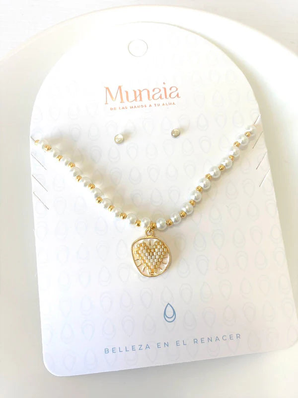 The Necklace MUN-027 is a timeless and elegant jewelry set that exudes sophistication and artisanal charm. This delicate necklace features lustrous pearls accented with golden beads, creating a harmonious and refined design. At its center is a beautifully crafted pendant adorned with a beaded heart motif in soft, neutral tones, adding a touch of warmth and sentimentality. The set includes matching pearl earrings, making it perfect for a complete, polished look. Ideal for special occasions or adding a classic touch to everyday outfits, the Necklace MUN-027 celebrates beauty, craftsmanship, and elegance.