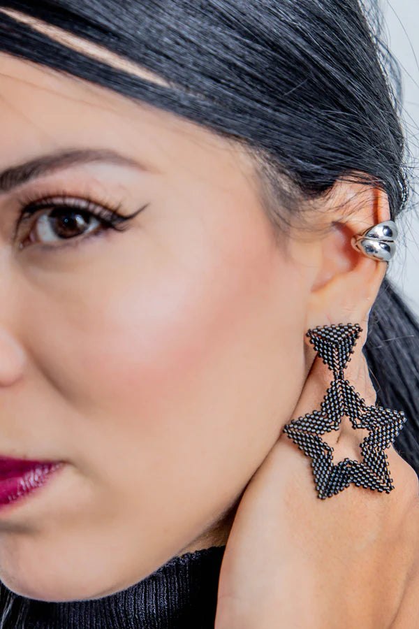 The Earrings MUN-064 are bold, handcrafted statement pieces that bring a modern edge to artisanal jewelry. Featuring intricately beaded star-shaped designs in sleek black, these earrings are lightweight yet eye-catching. Perfect for making a stylish impression, they embody a balance of elegance and individuality. Each pair is meticulously crafted, reflecting the expertise of skilled artisans and the principles of slow fashion. Ideal for both casual and formal occasions, the Earrings MUN-064 add a touch of sophistication and artistry to any look.