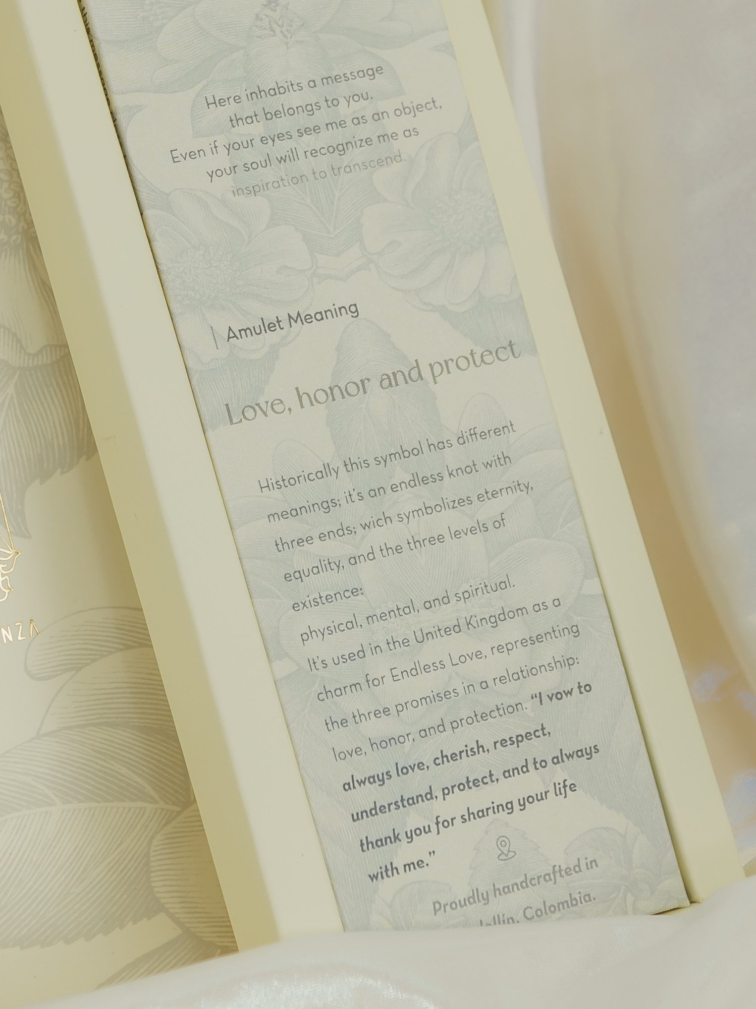 Amulet meaning: Historically this symbol has different meanings; it’s an endless knot with three ends; wich symbolizes eternity, equality, and the three levels of existence: physical, mental, and spiritual. It’s used in the United Kingdom as a charm for Endless Love, representing the three promises in a relationship: love, honor, and protection. “I vow to always love, cherish, respect, understand, protect, and to always thank you for sharing your life with me.