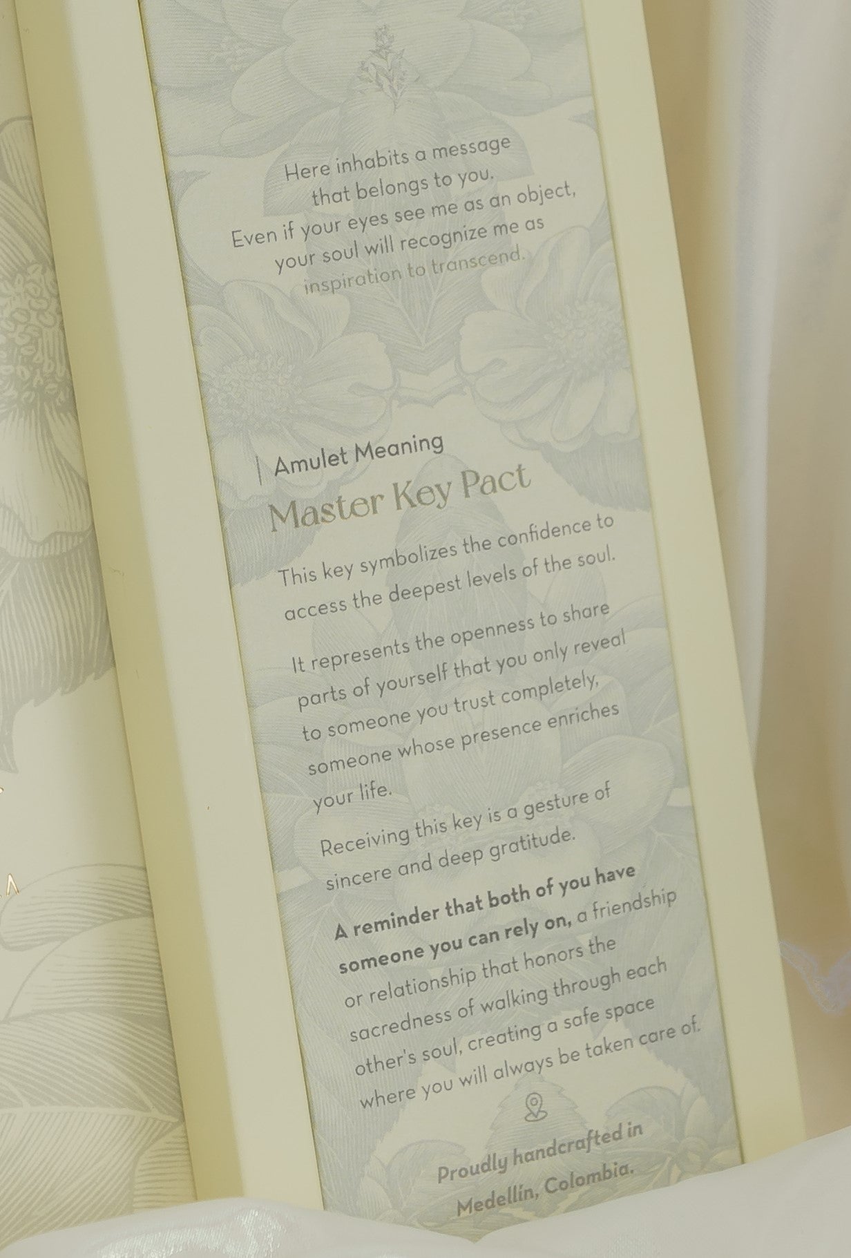 This key symbolizes the confidence to access the deepest levels of the soul. It represents the openness to share parts of yourself that you only reveal to someone you trust completely—someone whose presence enriches your life. Receiving this key is a gesture of sincere and deep gratitude. A reminder that both of you have someone you can rely on, a friendship or relationship that honors the sacredness of walking through each other's soul, creating a safe space where you will always be taken care of.
