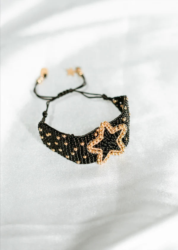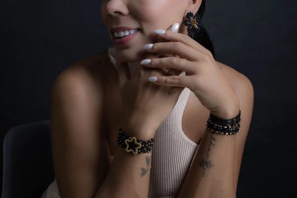 The Bracelet MUN-039 is a captivating blend of artistry and elegance, handcrafted to perfection. This adjustable bracelet features intricate black beading with golden accents, forming a bold star motif outlined in shimmering gold beads. Its striking design adds a celestial charm to your look, making it the perfect accessory for both casual outings and special occasions. Created with attention to detail by skilled artisans, this bracelet is a testament to slow fashion principles, offering a unique and timeless addition to your jewelry collection. Comfortable and versatile, the Bracelet MUN-039 is more than an accessory—it's a statement of style and craftsmanship.