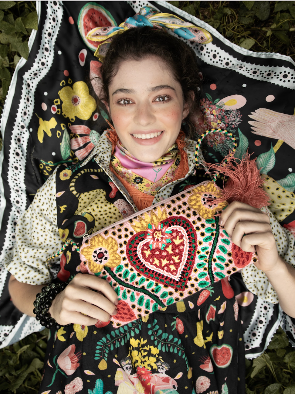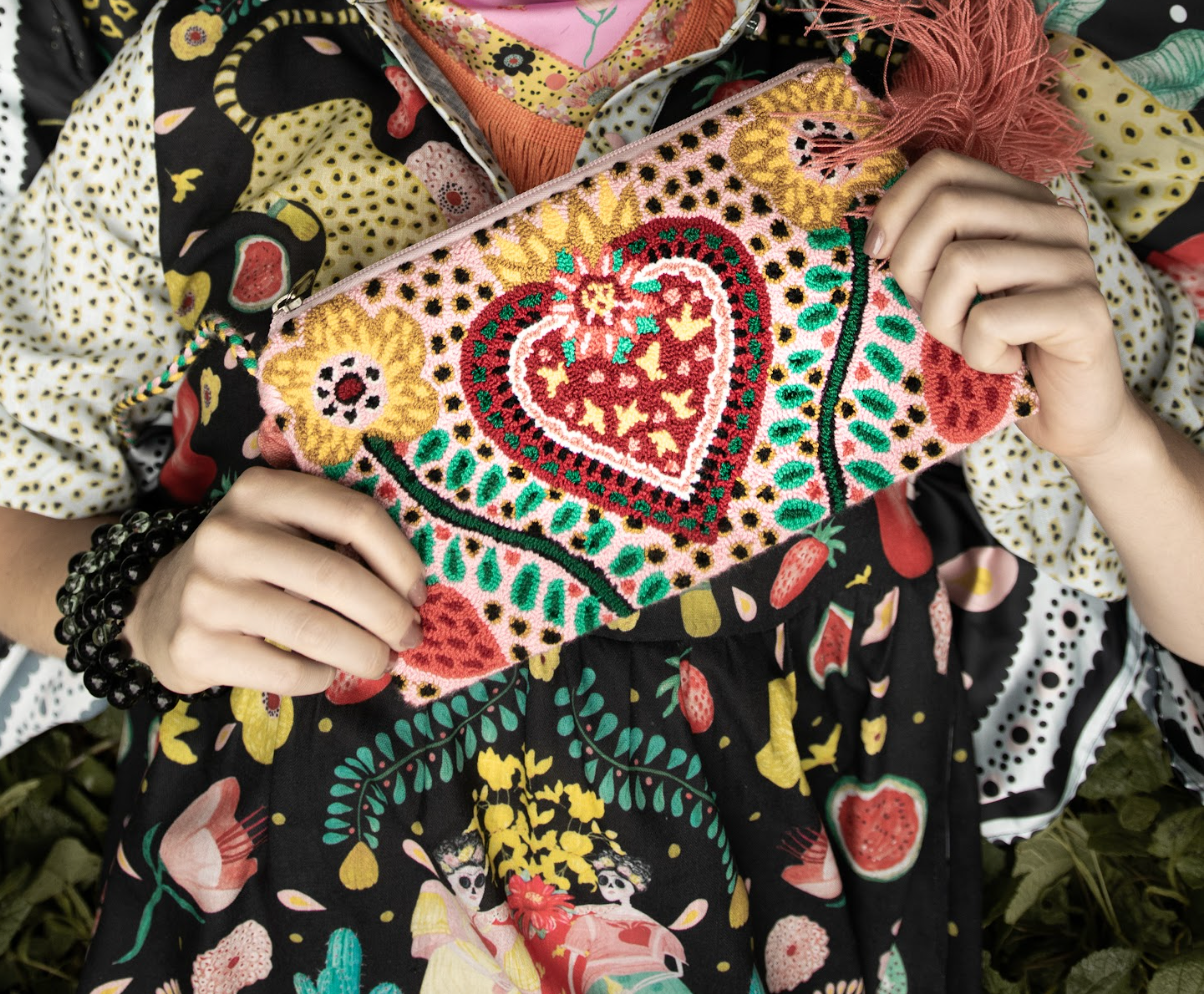 The Upholstered Heart Pouch is a vibrant and artistic accessory designed to bring joy and functionality to your everyday style. Handcrafted with intricate embroidery, it features a bold heart motif surrounded by playful floral and geometric patterns in a lively color palette. The zippered closure is adorned with a charming tassel, adding a touch of whimsy. Perfect for carrying your essentials, this pouch is both practical and stylish. Celebrate craftsmanship and individuality with the Upholstered Heart Pouch, a delightful piece that reflects the beauty of artisanal design and slow fashion.