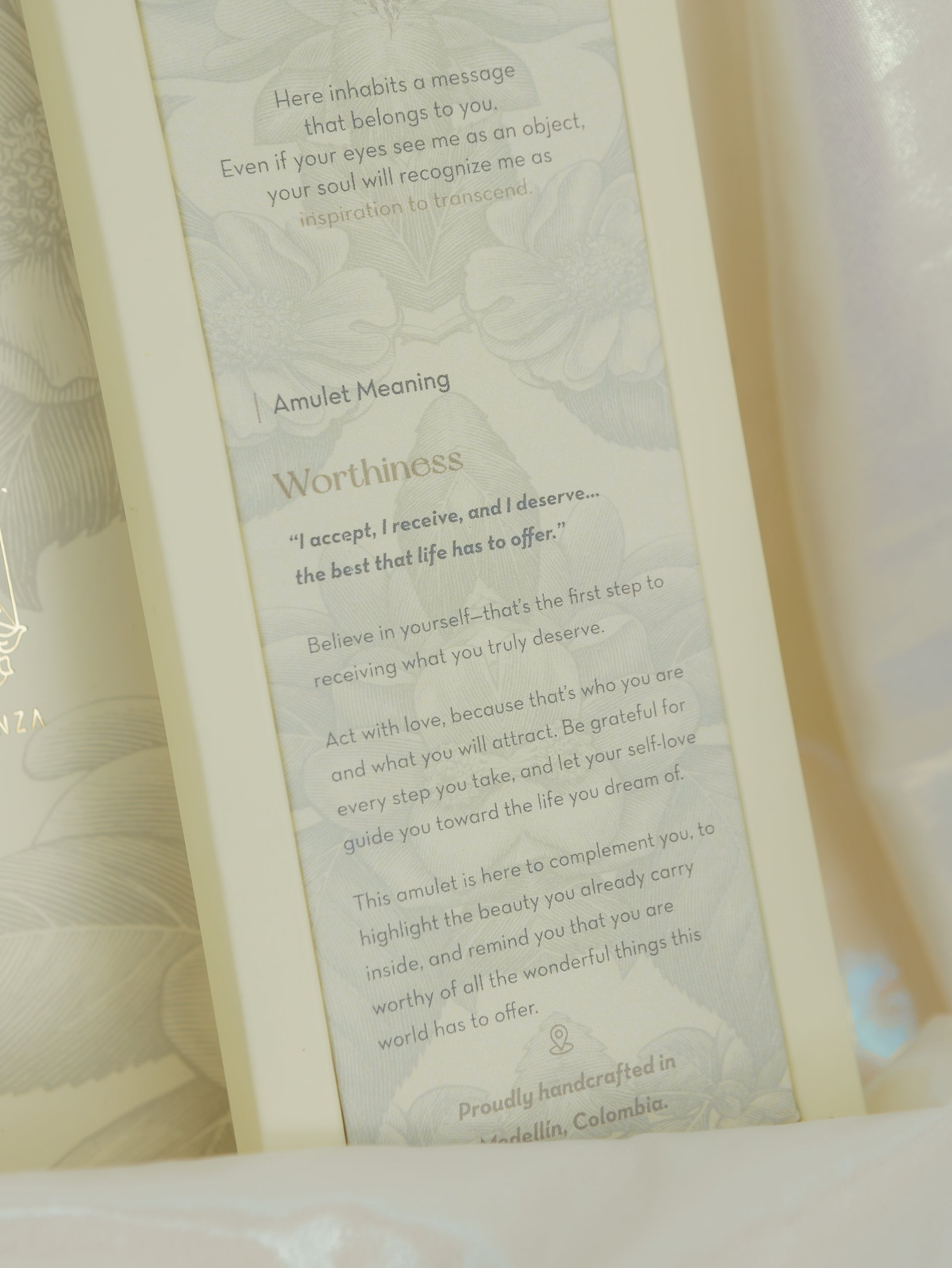 Amulet meaning: I accept, I receive, and I deserve... the best that life has to offer. Believe in yourself, that’s the first step to receiving what you truly deserve. Act with love, because that’s who you are and what you will attract. Be grateful for every step you take, and let your self-love guide you toward the life you dream of.