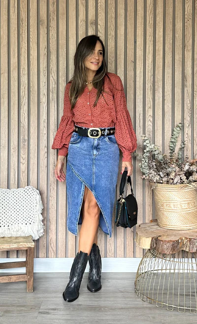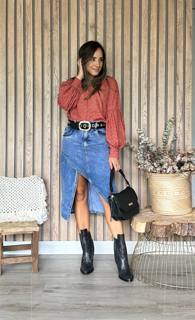 The Amsterdam Terracotta Shirt brings effortless elegance to your everyday look. Featuring puffed long sleeves with buttoned cuffs, a flattering V-neckline, and a classic button placket, this shirt combines comfort and sophistication.
