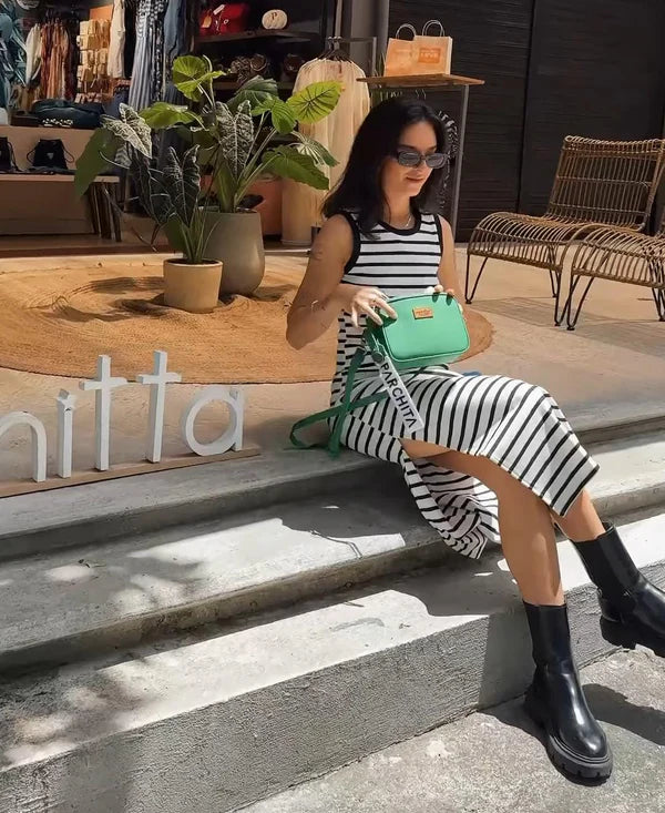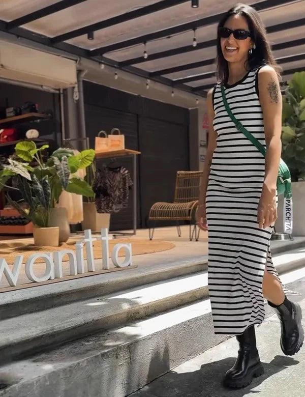 Elevate your casual wardrobe with the effortlessly chic Dress Georgia. Featuring a timeless black-and-white striped pattern, this sleeveless midi dress is a versatile addition to your closet. Designed for style and comfort, it transitions seamlessly...