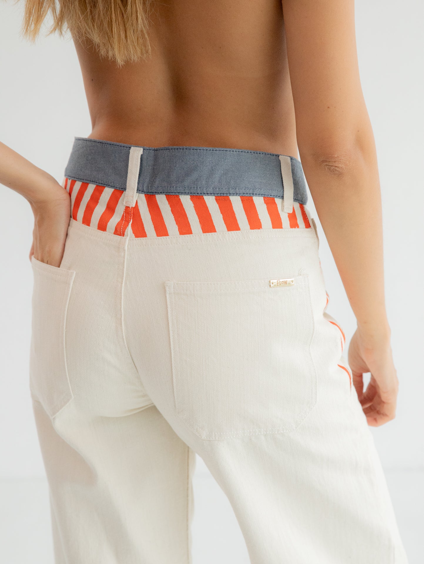 Double denim pocket jean with vertical stripes, the inside pocket with bias stripes and bias waves