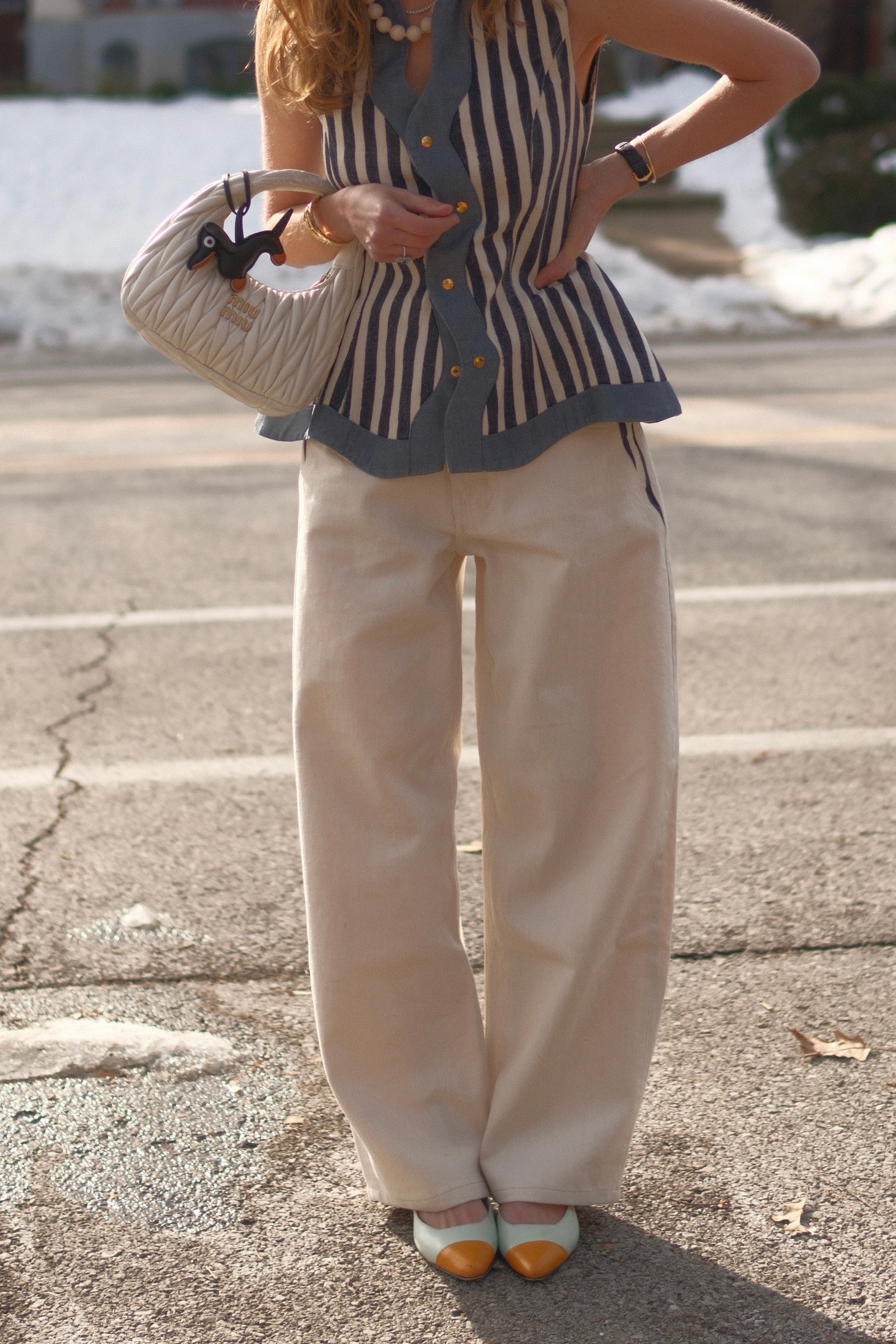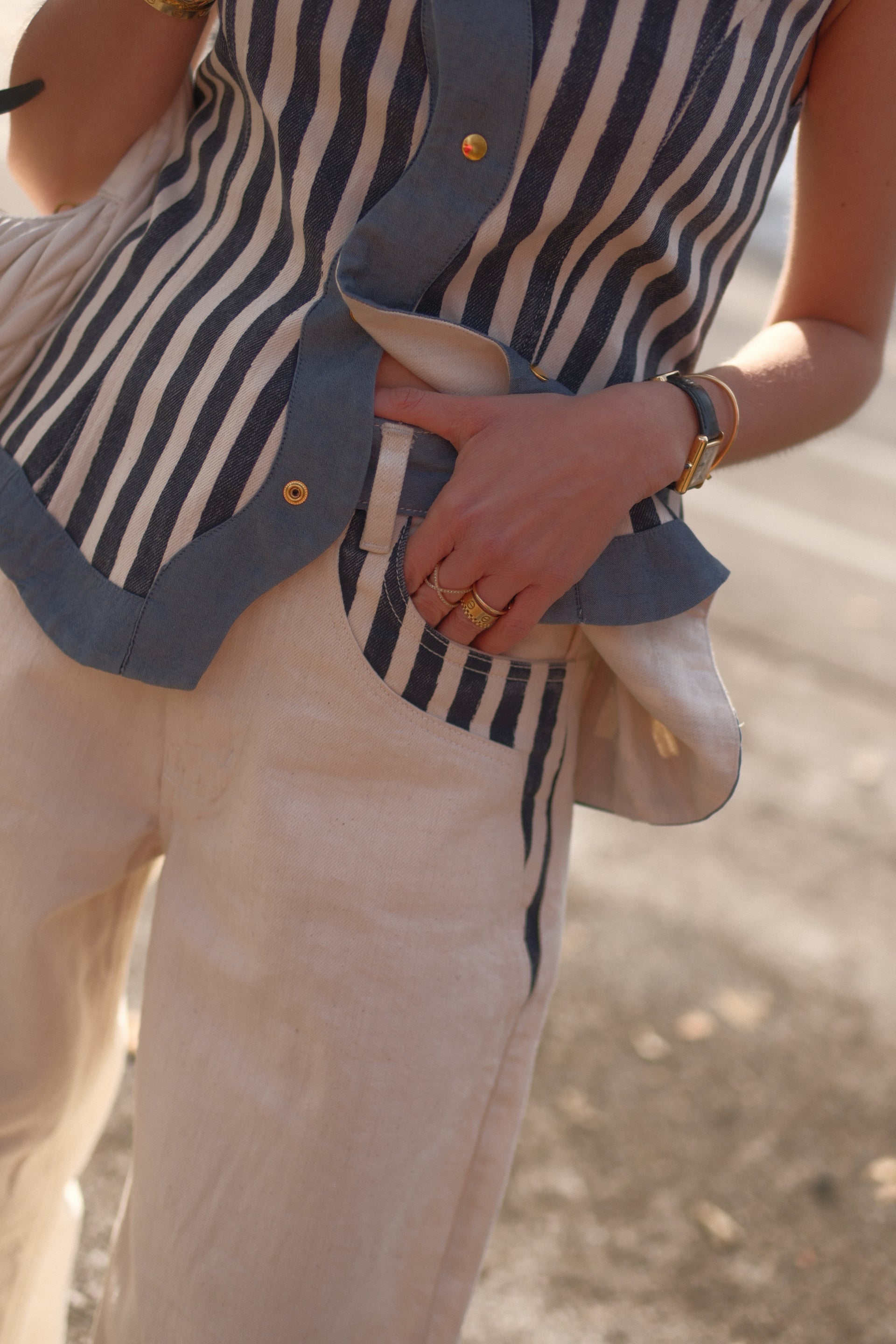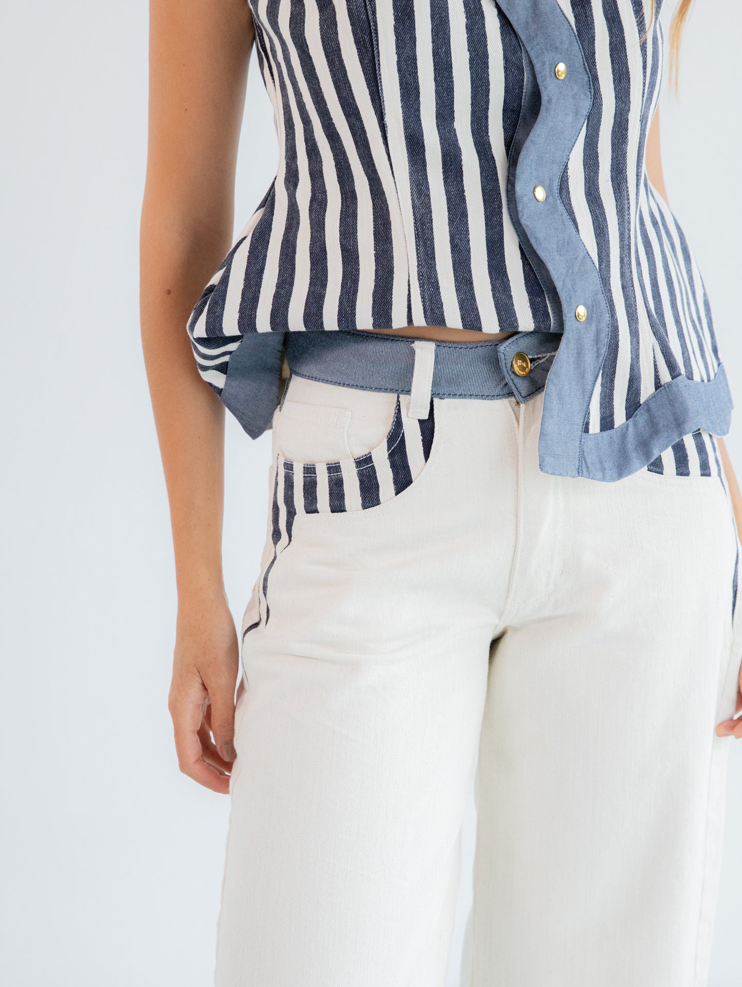 Double denim pocket jean with vertical stripes, the inside pocket with bias stripes and bias waves