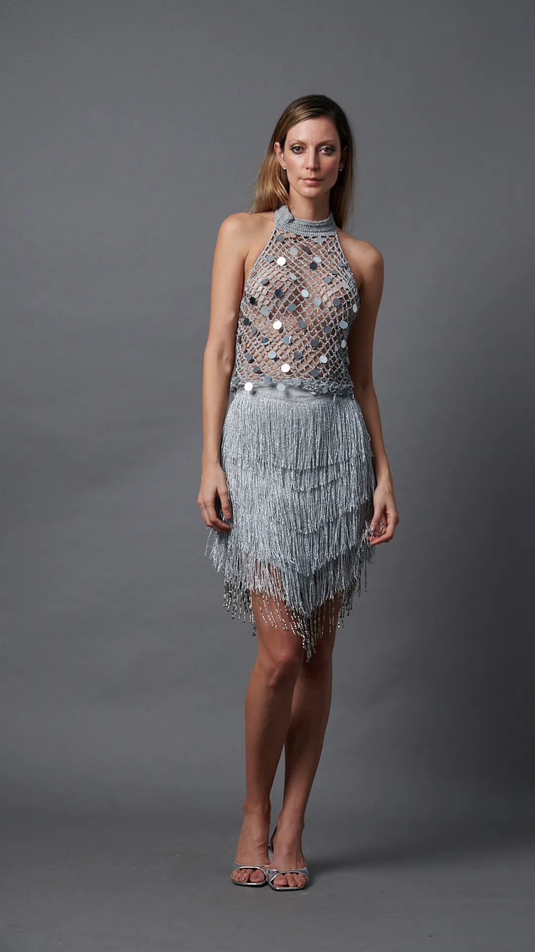Introducing our mini skirt, available in a #cm length and with an elastic fastening system for a perfect fit. The fabric offers elasticity and softness to the touch, with a shiny finish that highlights our elegant silver fringe, which falls in a V-shape thanks to our innovative cut. To top it all off, our skirt features exquisite details of fine shimmering beading that ornament the entire edge of the silver skirt.