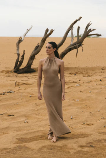 Crafted through an artisanal process with knitted fabric, featuring crochet finishes and details. Our Duna Dress is designed with Arena yarn, an open back, and a tie at the neck to highlight your figure and wear it both day and...