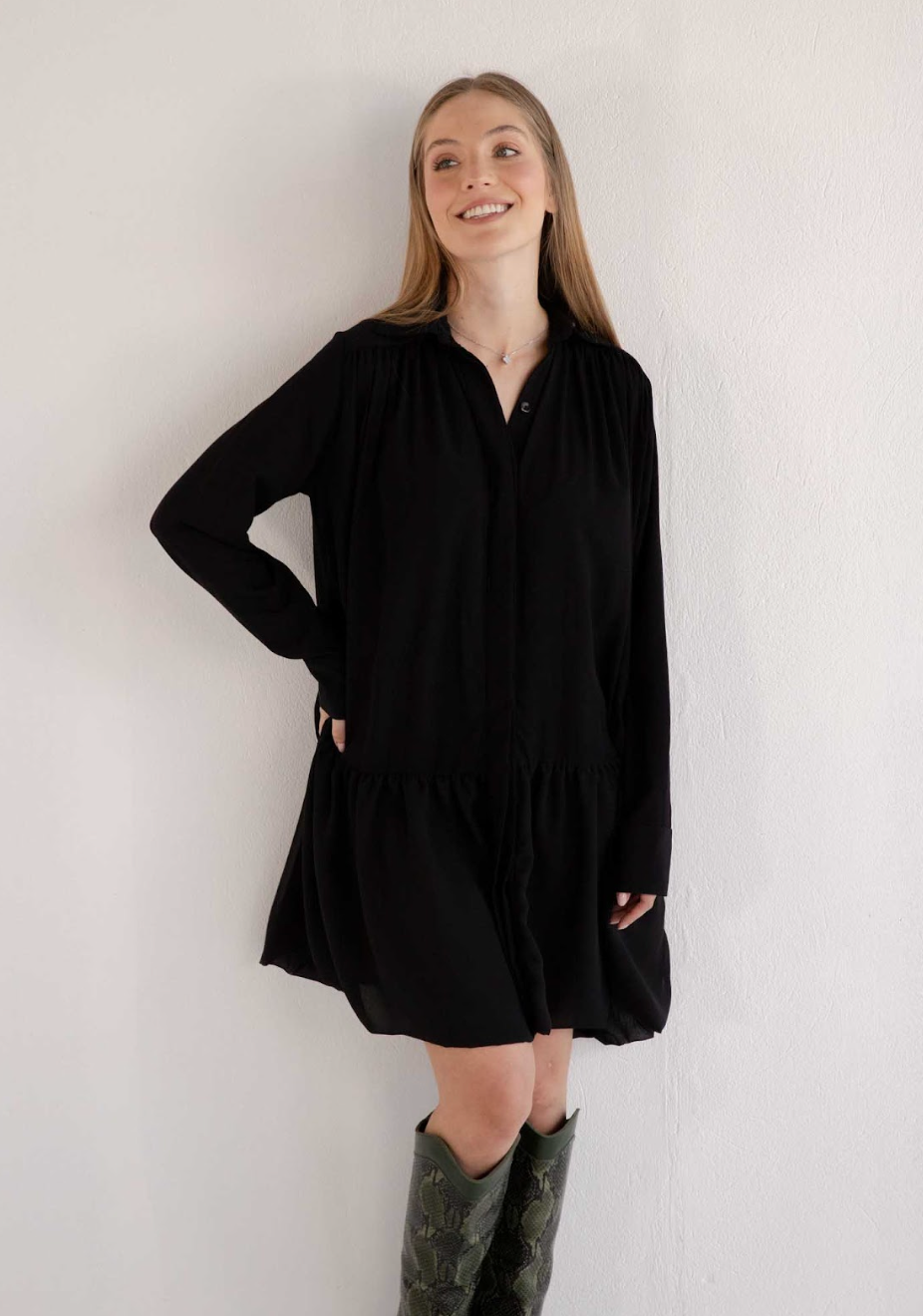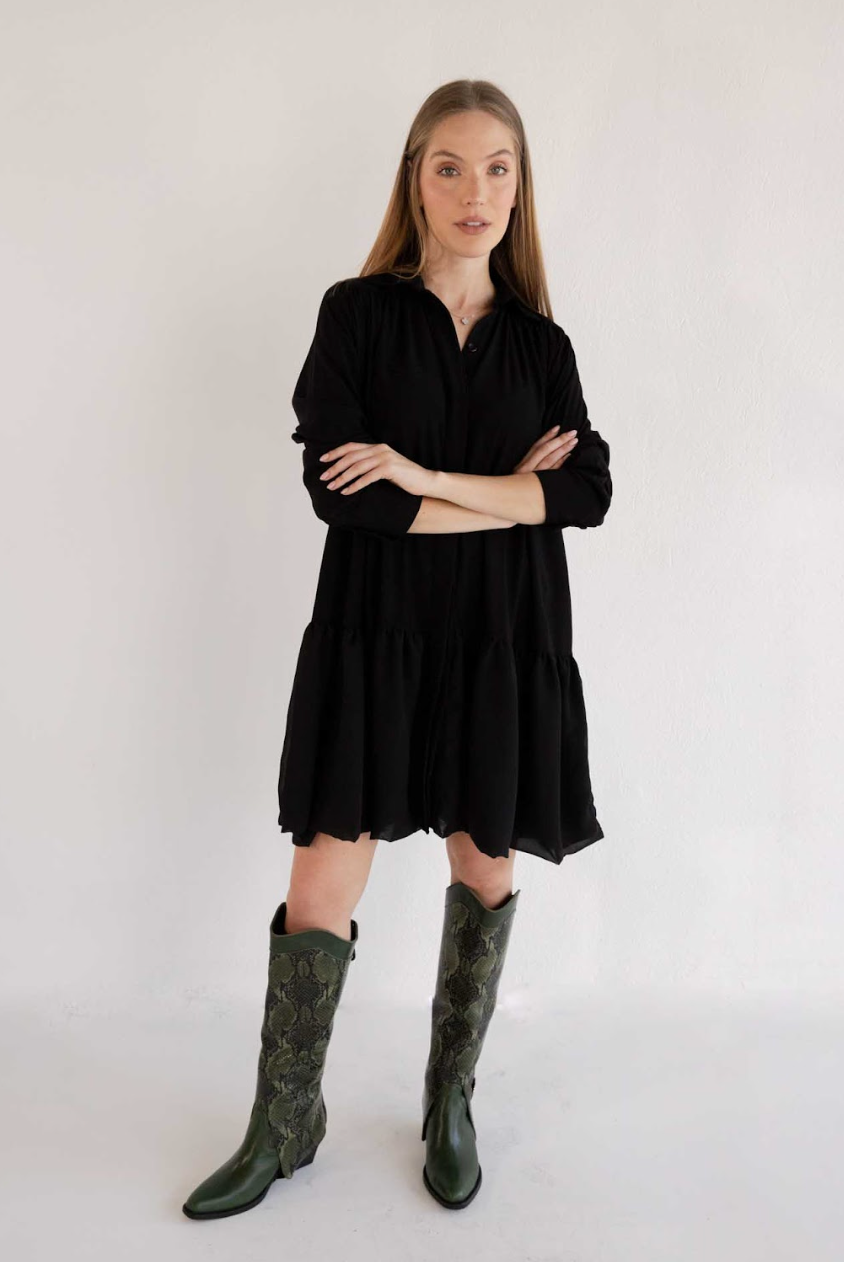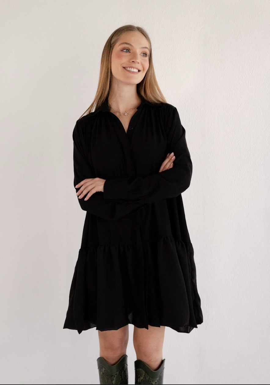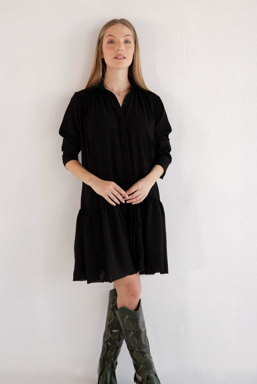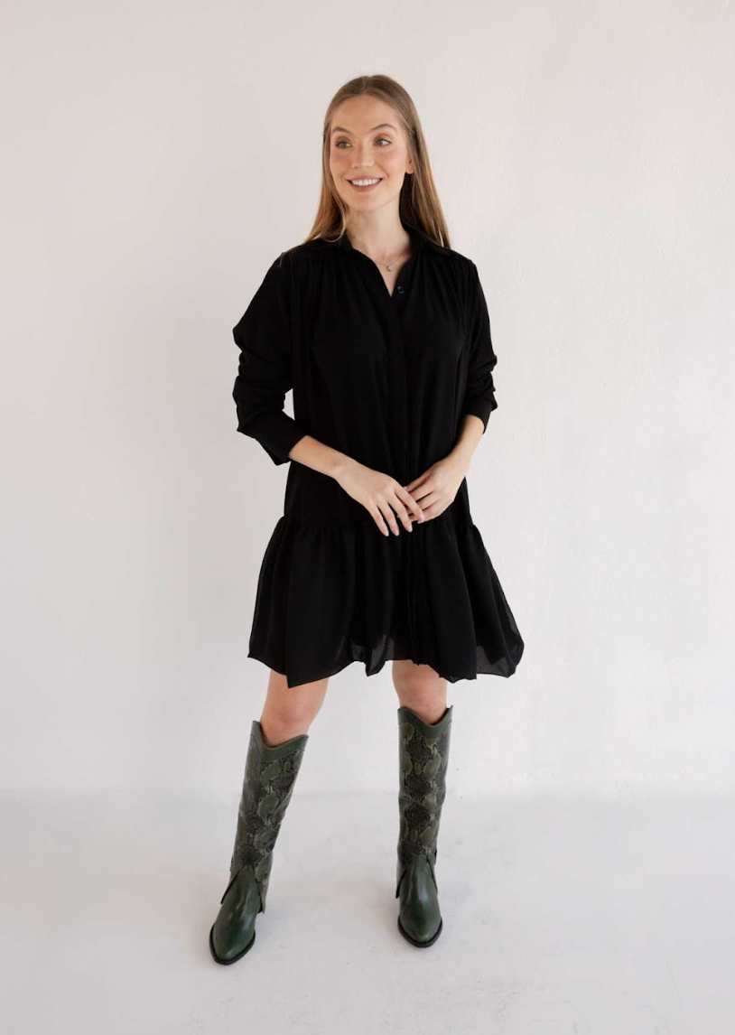 The Gregory Black Dress is the epitome of effortless elegance and timeless style. This shirt-dress features a flowy silhouette with subtle gathering details that add texture and movement, creating a flattering and comfortable fit. The minimalist design, highlighted by a button-up front and a classic collar, makes it a versatile piece that transitions seamlessly from casual to chic. Perfect for any occasion, the Gregory Black Dress is crafted with care and attention to detail, embodying sophistication and a commitment to slow fashion principles.