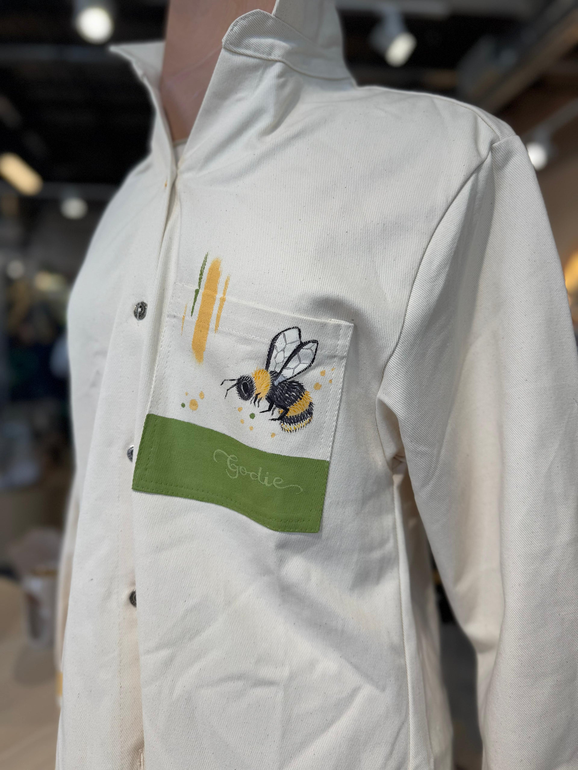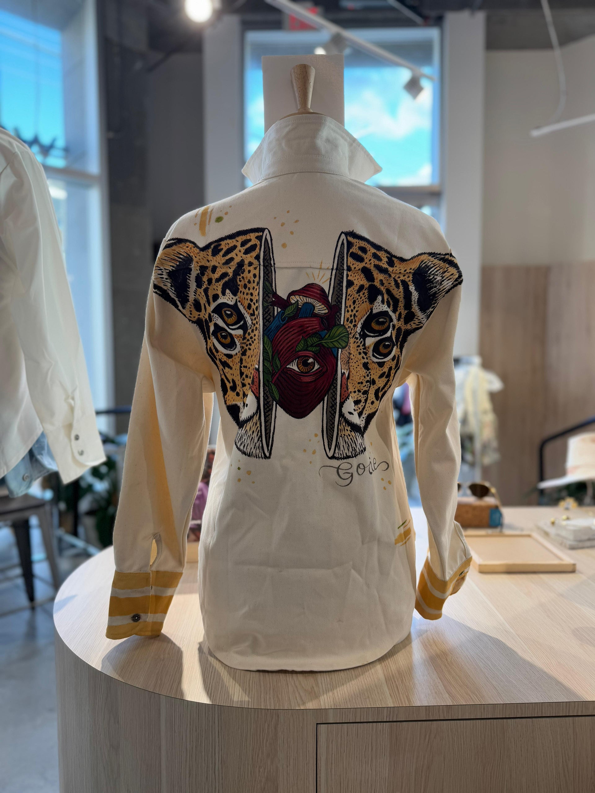 Through their collaboration with us, Godie’s dynamic artistic expression adds a bold and creative flair to our designs, merging visual storytelling with ethical fashion and craftsmanship.