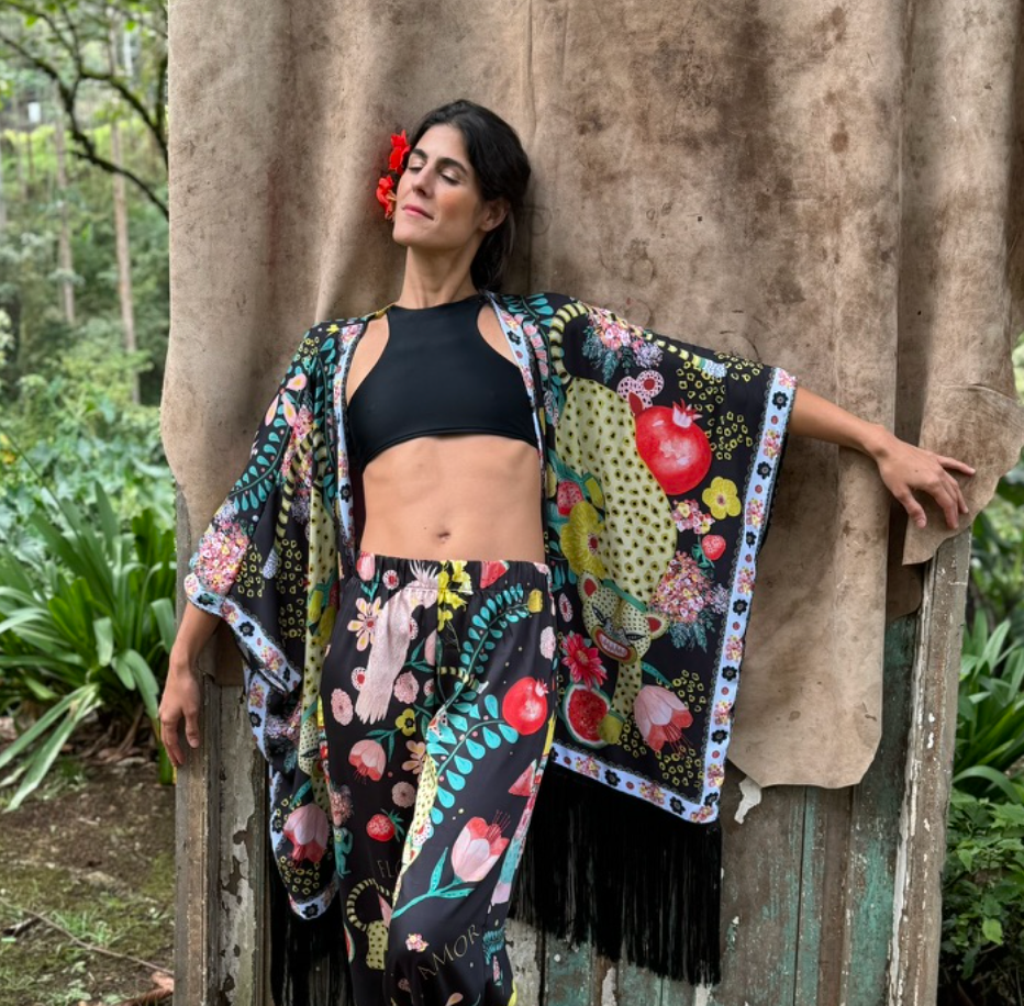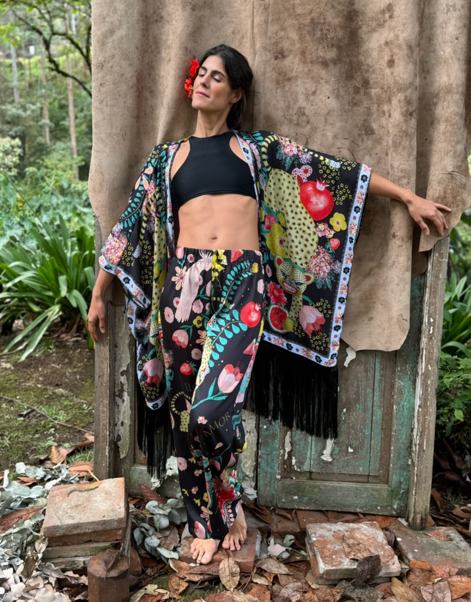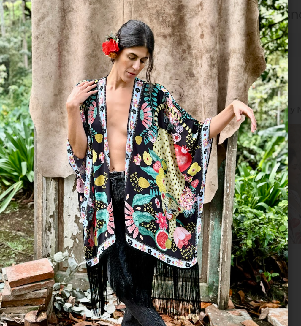 The Black Kimono is a statement piece that blends art and elegance seamlessly. Featuring a vibrant tropical-inspired design with exotic flora and fauna on a black base, this kimono is perfect for adding a bold touch to any outfit. The lightweight fabric drapes beautifully, while the fringe details along the hem add movement and charm. Its open-front style offers versatility, making it ideal for layering over casual or formal ensembles. Whether for a beach outing, a casual event, or a stylish night out, the Black Kimono embodies slow fashion and celebrates bold, artistic expression.