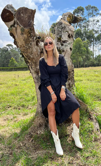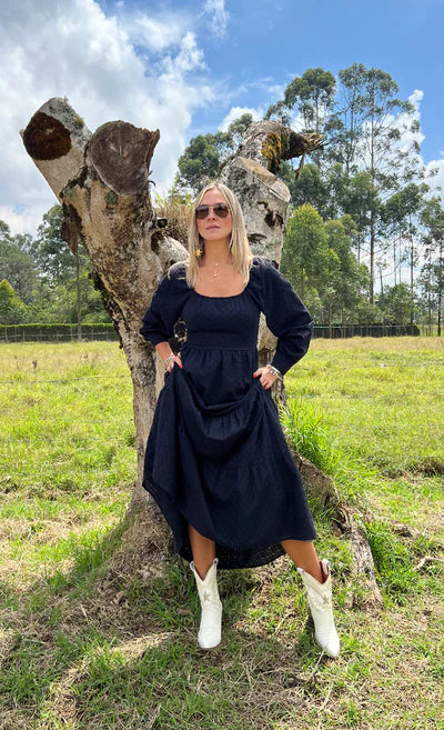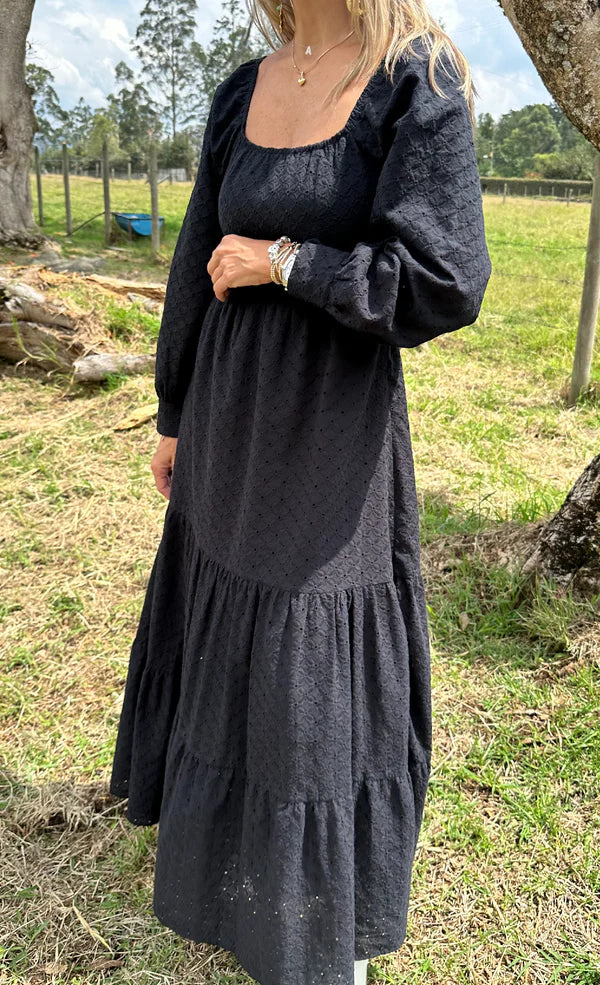 Embrace timeless elegance with our Long Black Bow-Back Dress. Crafted from lightweight flat-woven eyelet fabric, this dress features a sophisticated square neckline and graceful long sleeves with cuffed shirt-style ends, adding a touch of refinement to the flowing silhouette. The open-back design, tied with a delicate bow, brings an element of modern femininity and charm.