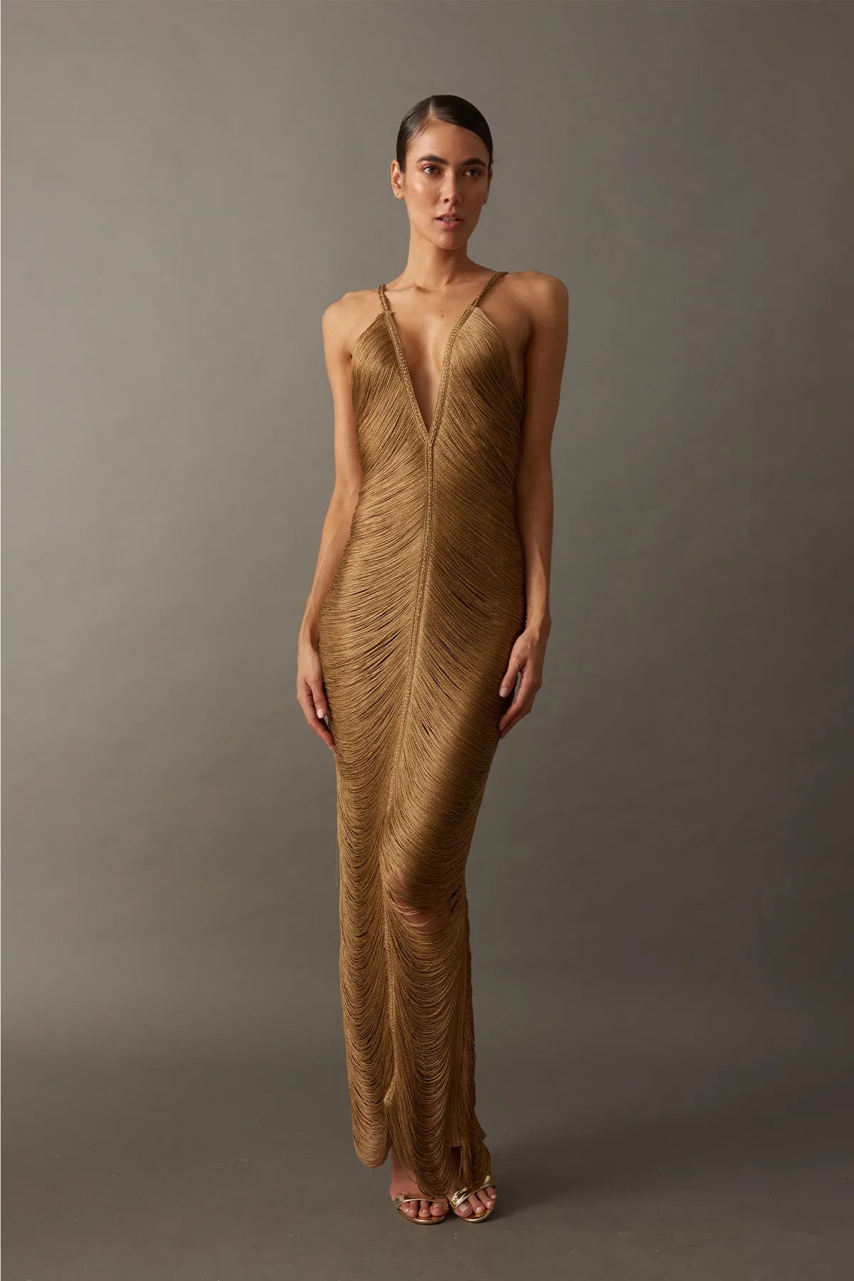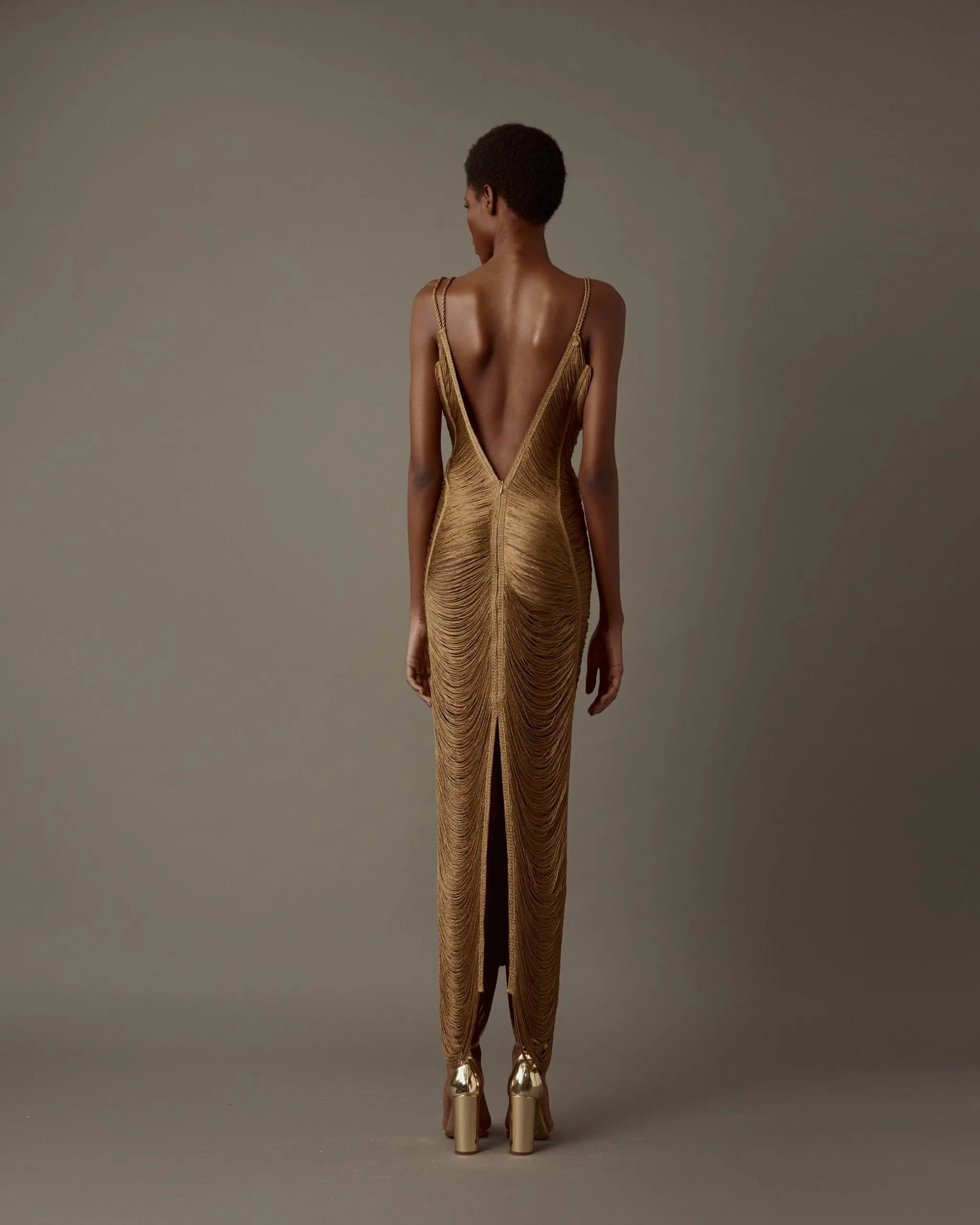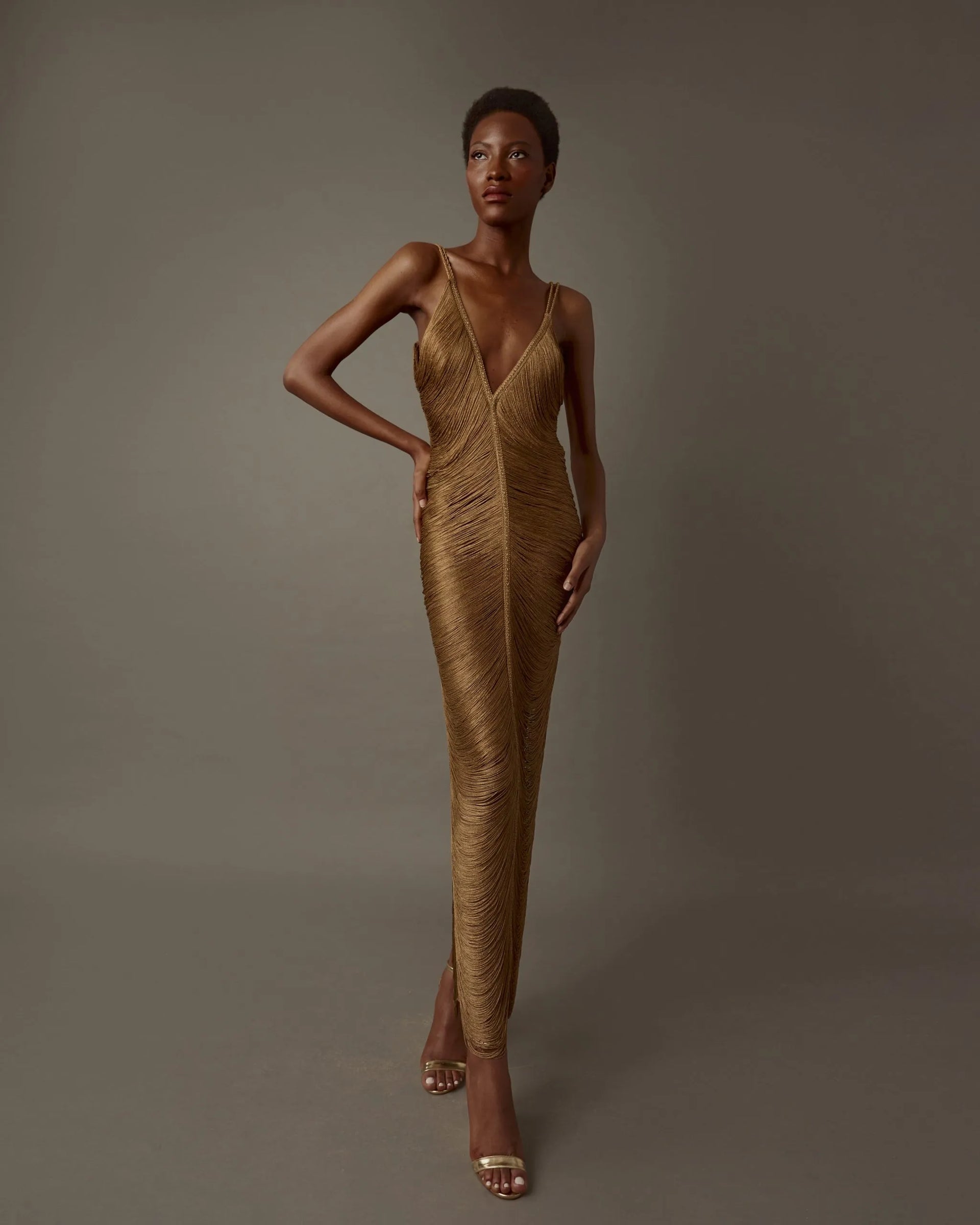 Con un elegante escote profundo en V, que te hará lucir una espalda definida acompañado de una abertura situada en la parte inferior posterior.