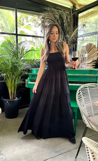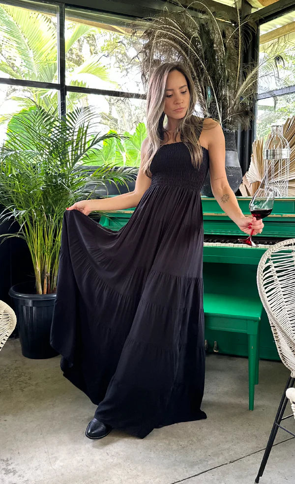 Vestido largo elaborado en tejido plano , busto y espalda con nido de abeja es decir enresortado , de silueta amplia y con muchos boleros en la falda.