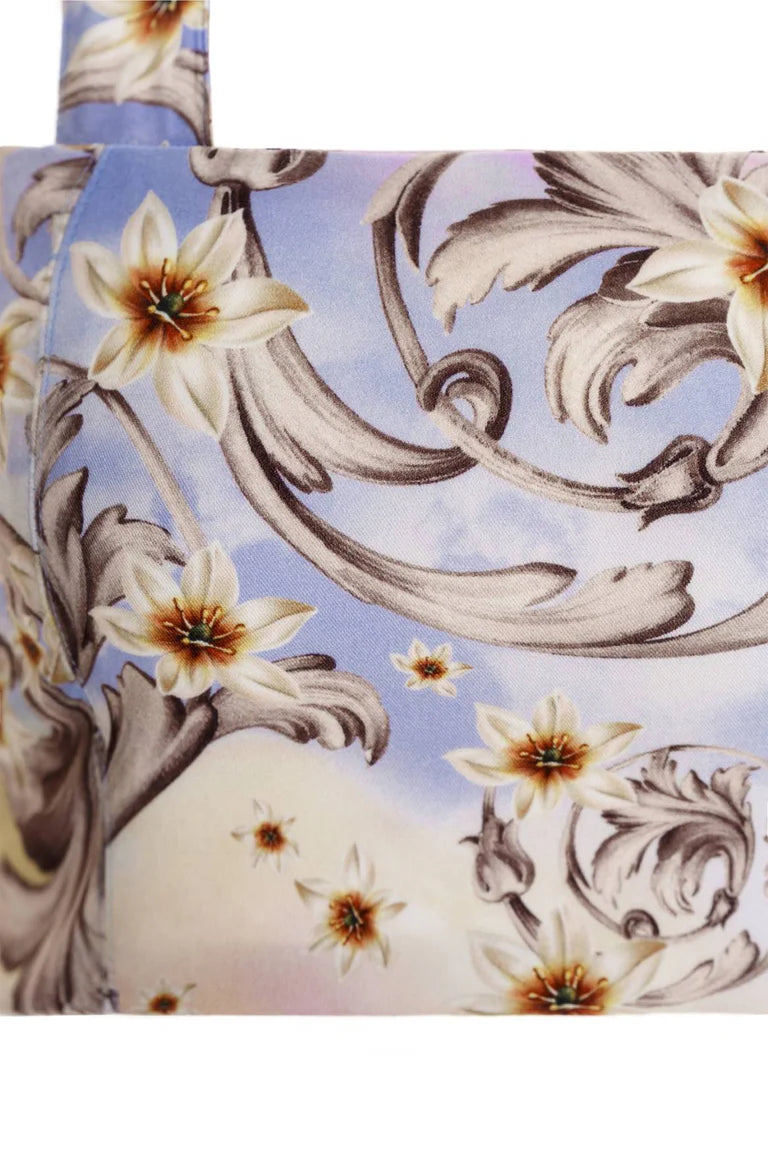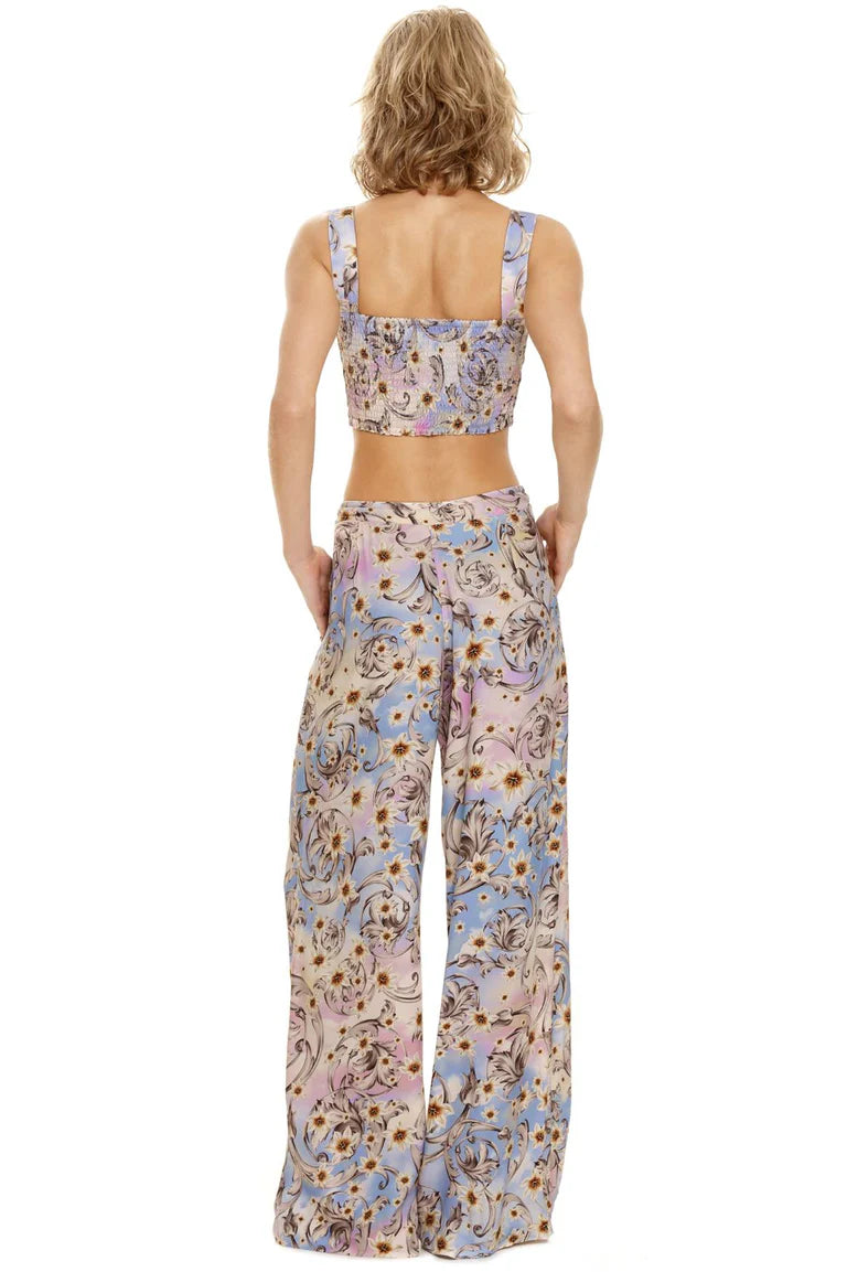 This two-piece set is crafted in a luxurious silk-like fabric adorned with intricate baroque floral patterns in pastel hues of lavender, blue, and blush pink. The crop top features a square neckline and smocked back...