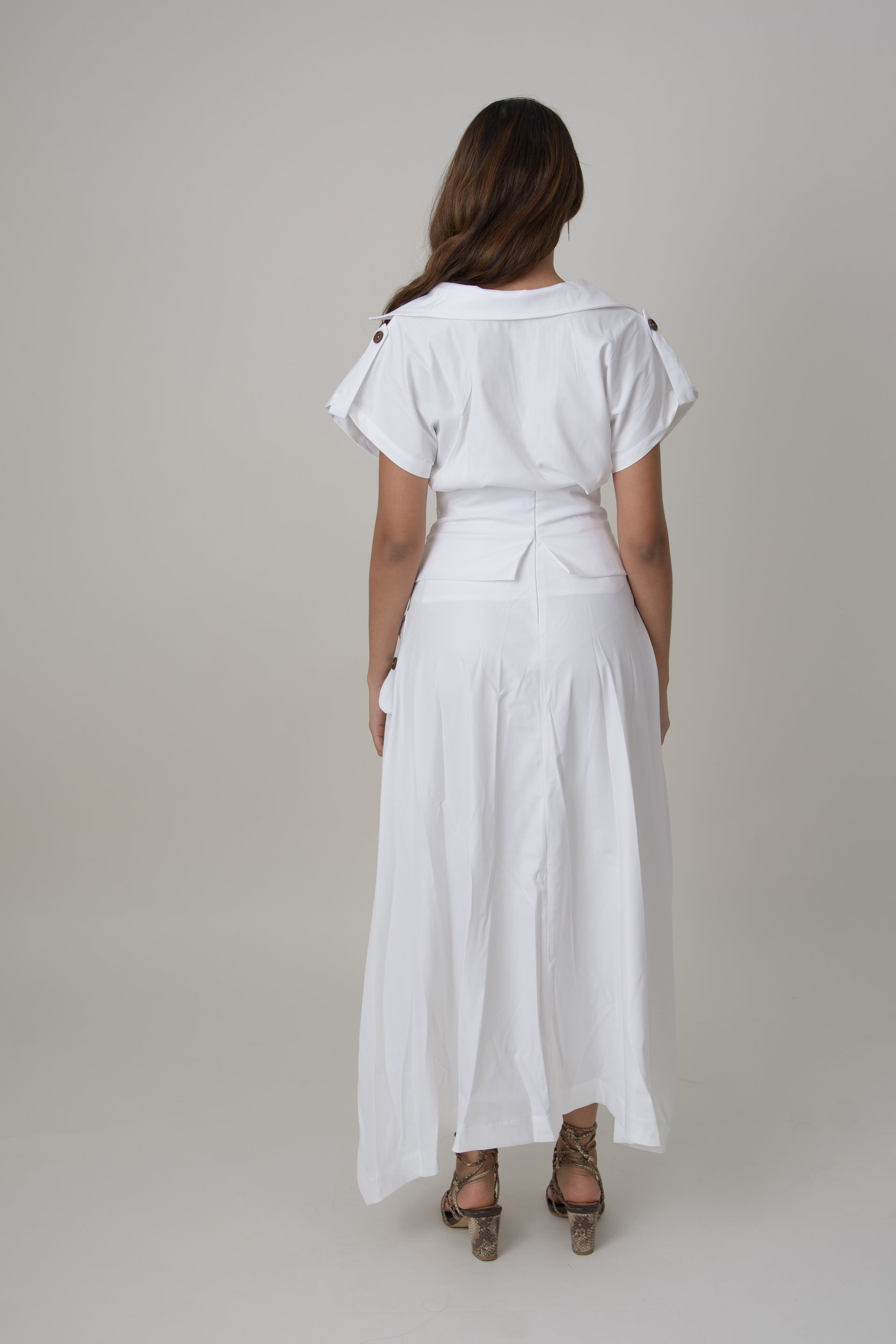 Asymmetrical-cut skirt, crafted from a lightweight material. Decorative buttons enhance its modern and versatile design.