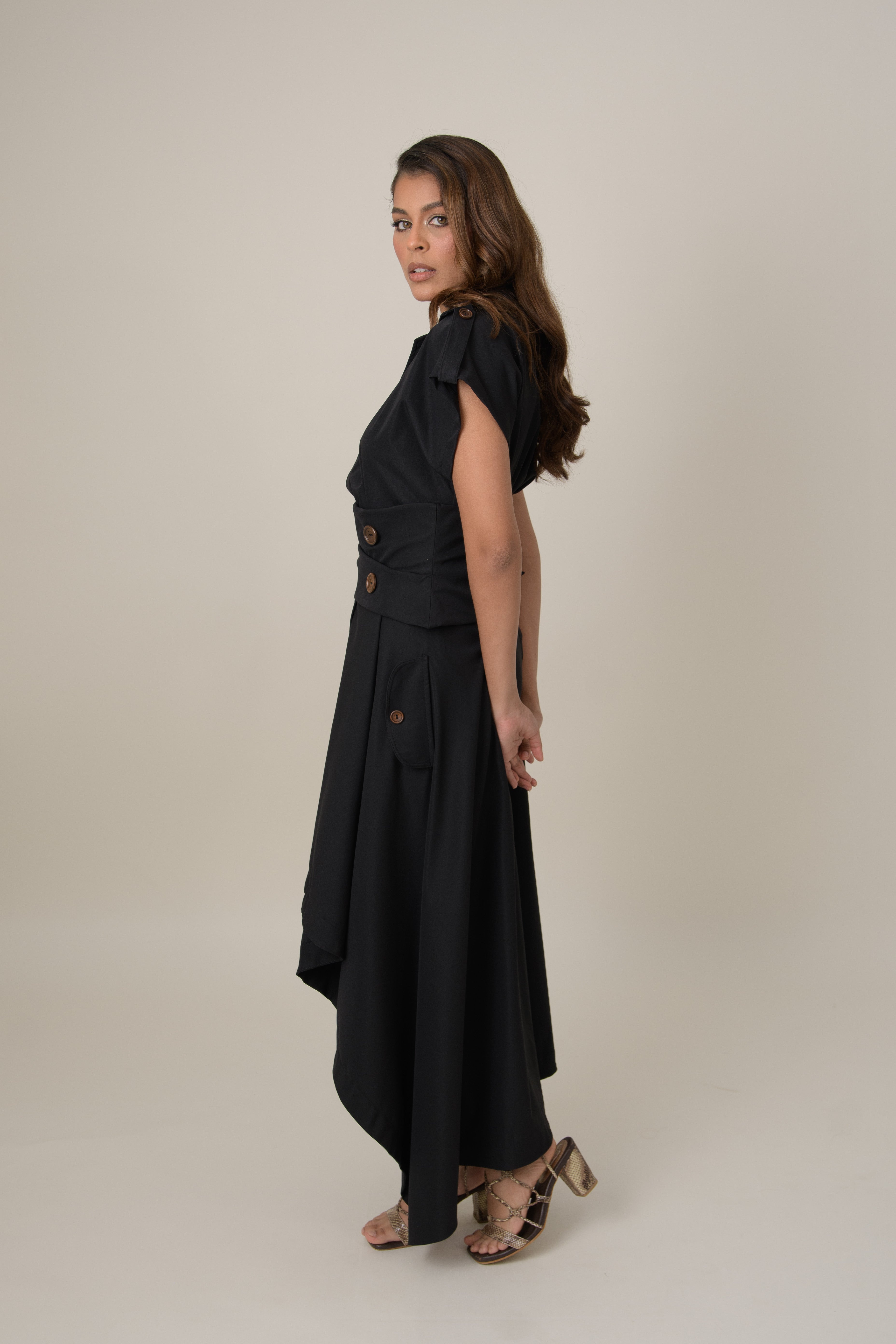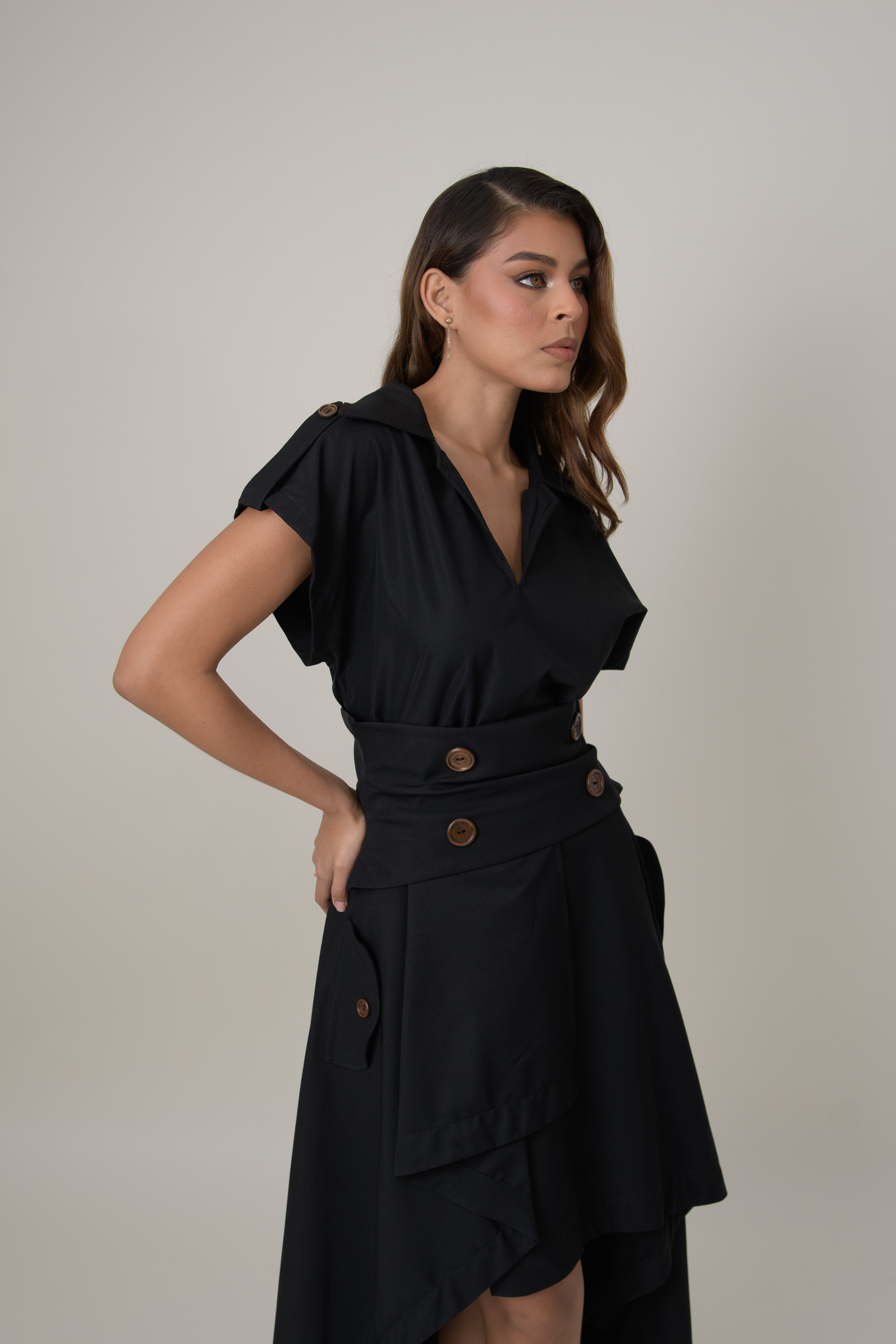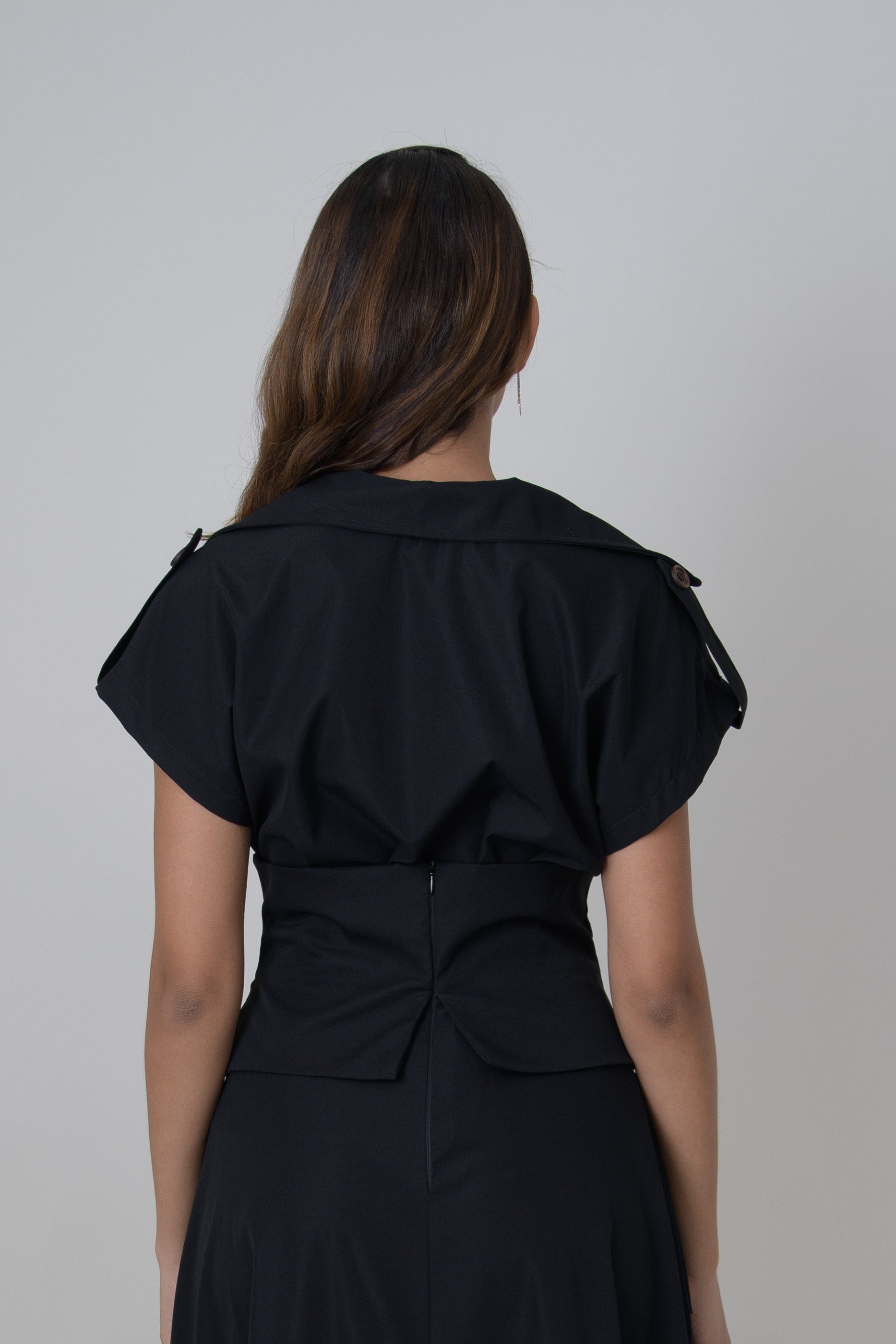 Short-sleeve blouse with tab detail, shirt collar and V-neckline, made from lightweight fabric.