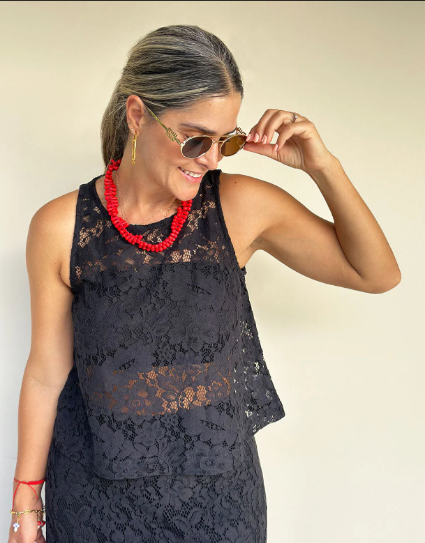This romantic black lace blouse features a rounded neckline and sleeveless cut for an effortlessly elegant look. The fitted silhouette is enhanced by delicate lace texture and a keyhole opening at the back, closed with a subtle button for a touch of charm.