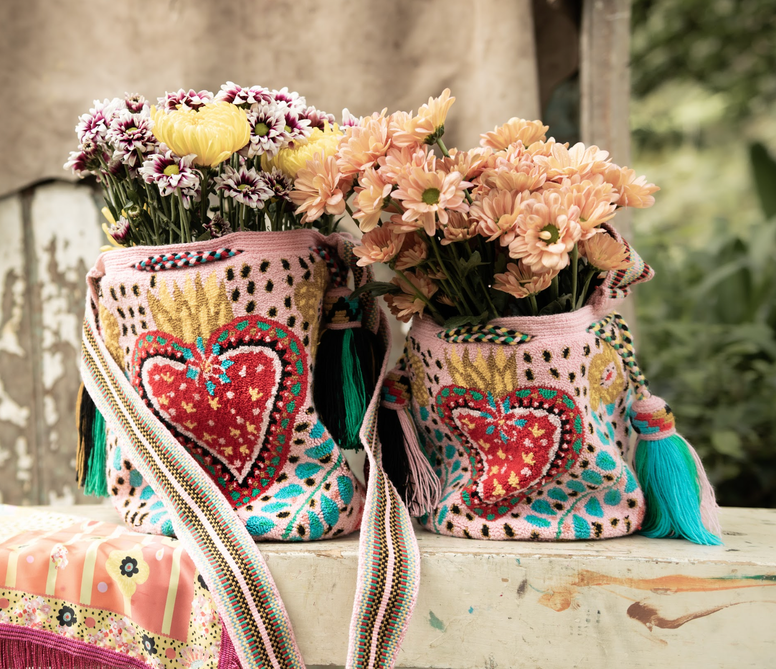 This Large Upholstered Heart Backpack is a handcrafted masterpiece designed for those who appreciate vibrant artistry and functionality. Made with high-quality materials, the bag features intricate embroidered heart motifs surrounded by colorful patterns, reflecting a bohemian and artisanal style. The spacious interior is perfect for carrying essentials, and the tasseled drawstring closure adds a playful yet practical touch. With its adjustable woven strap, this unique backpack ensures comfort and versatility, making it ideal for everyday use or as a standout accessory for special occasions.