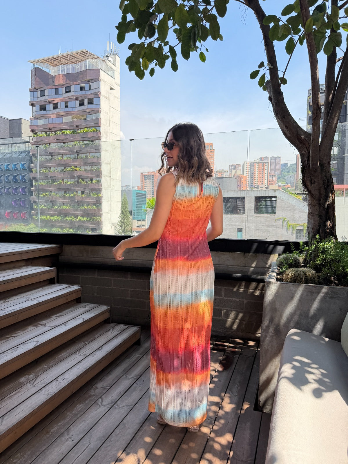 Inspired by tropical sunsets, the Aurora Dress by Wanitta blends warm tones in a vibrant ombré that flows effortlessly with every move.