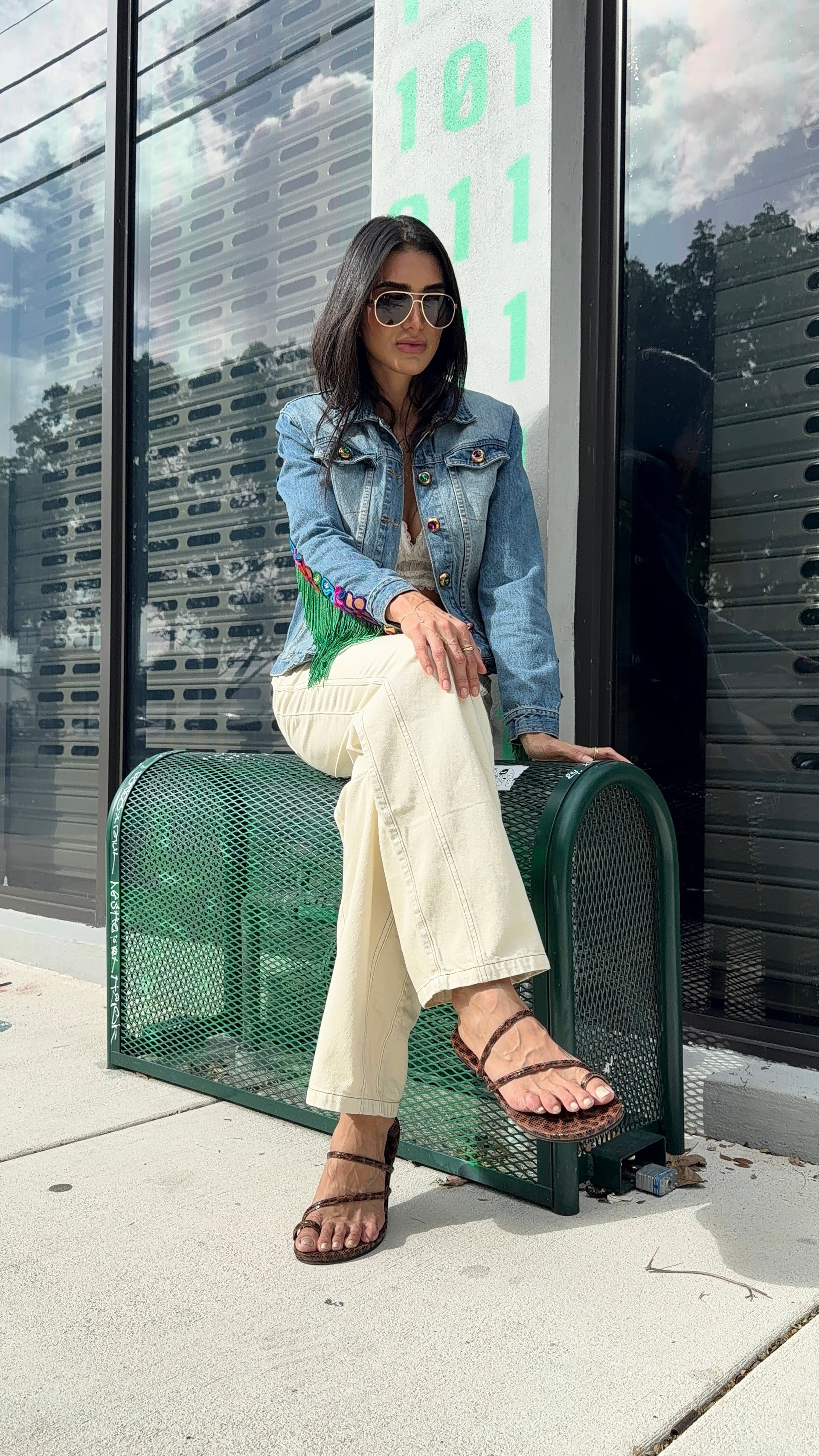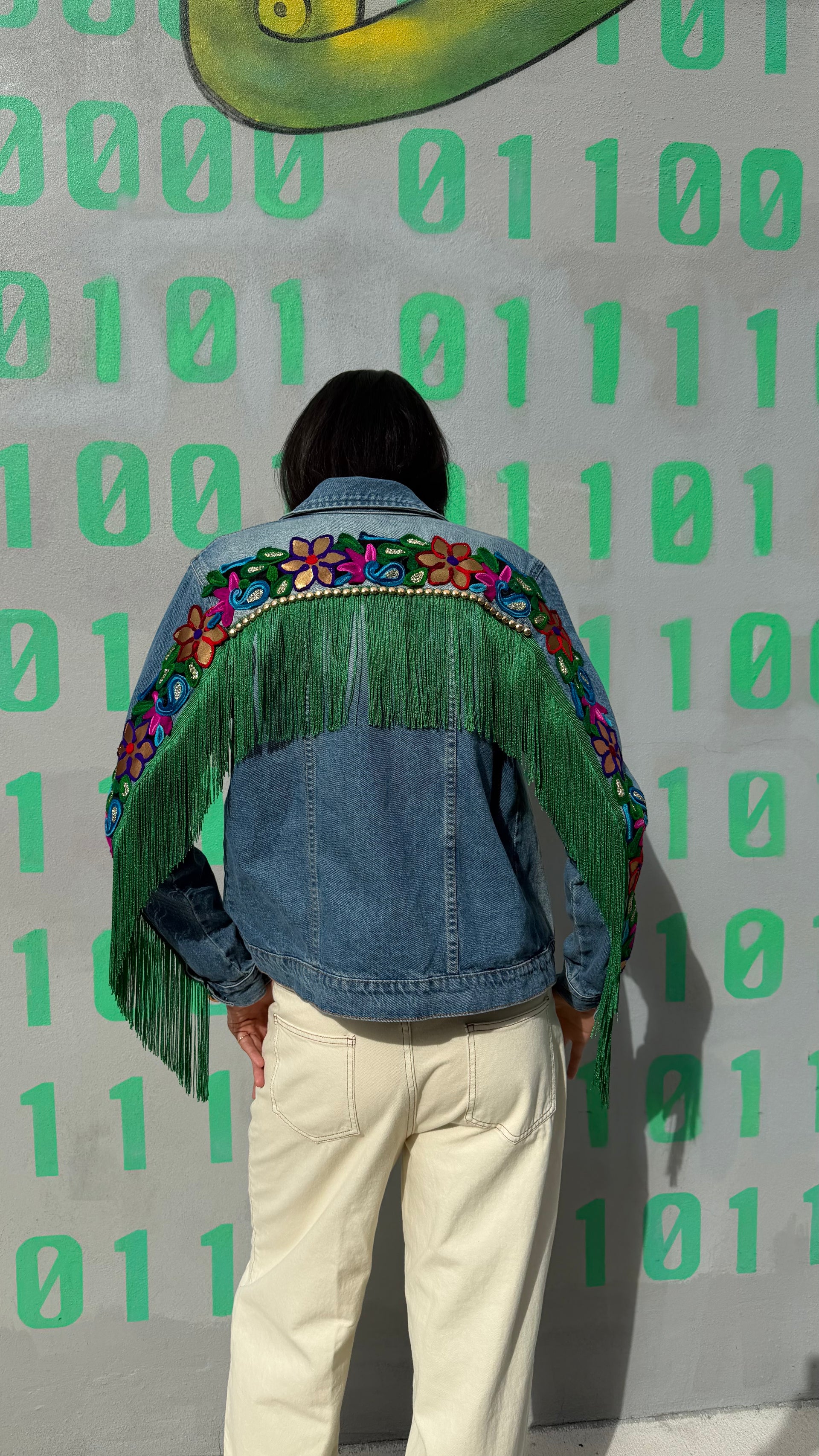 Inspired by the richness of tropical flora, this piece features vibrant green flowers and fringes that capture the lively spirit of the Amazon. Designed with gold-tone metallic studded rhinestone details, luxurious silk fringe, and premium decorative trim, it blends handcrafted artistry with standout style.
