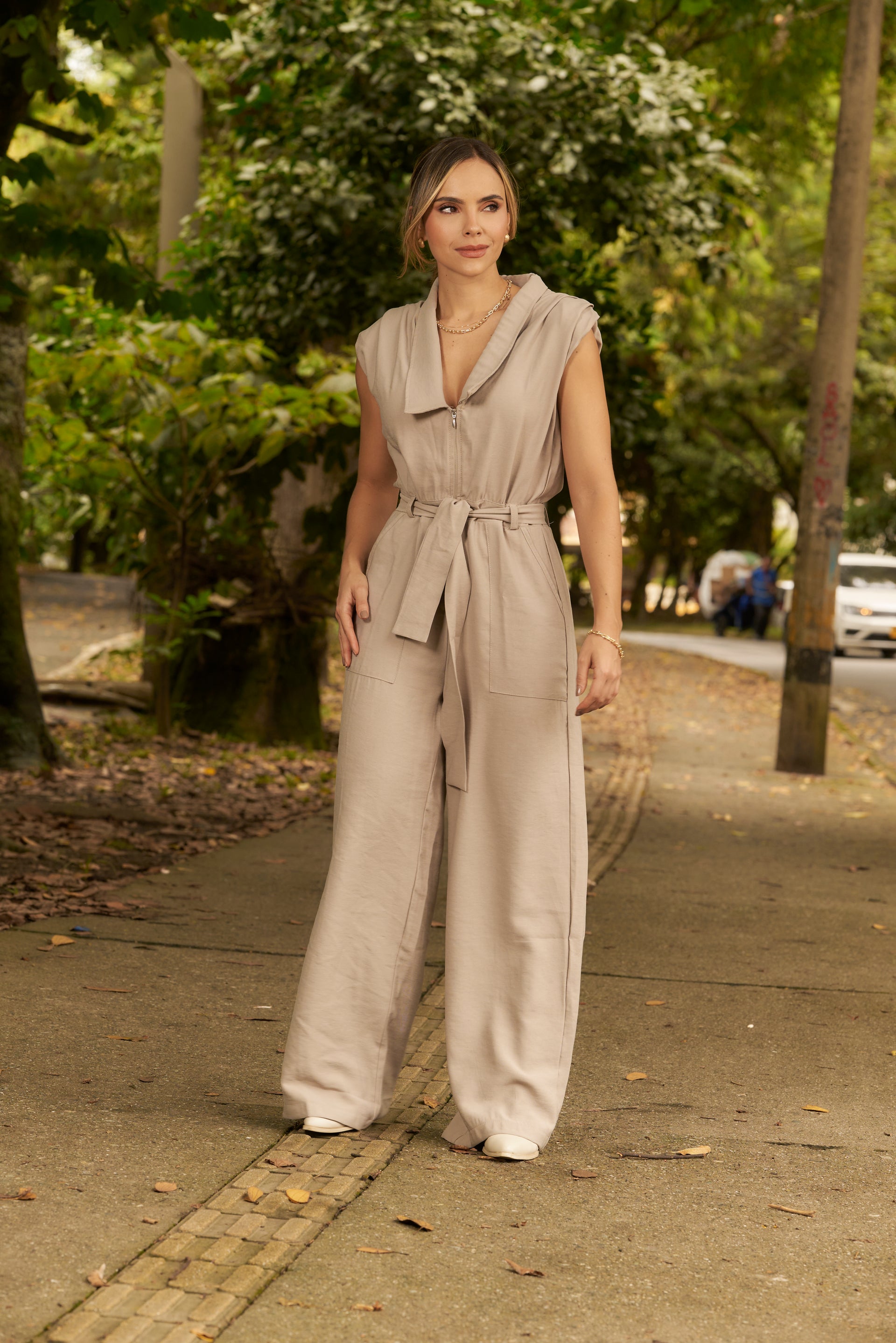This sand-colored jumpsuit features a flattering neckline and a versatile design, perfect for both casual days and more elegant looks. Its neutral tone pairs effortlessly with any style, while the belt accentuates the waist and the front zipper elongates the silhouette. Comfortable, modern, and easy to wear, it’s an essential piece for any occasion.
