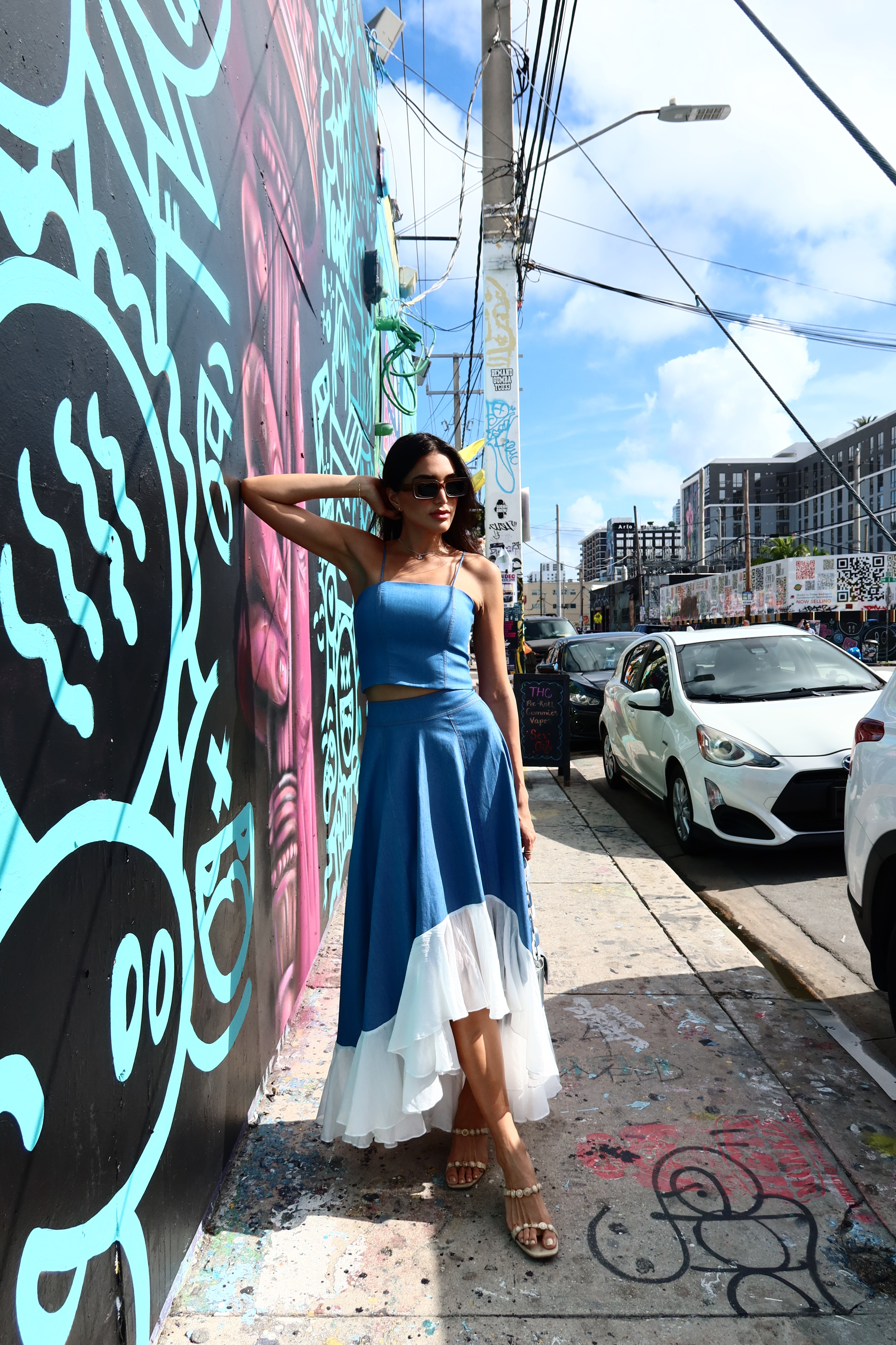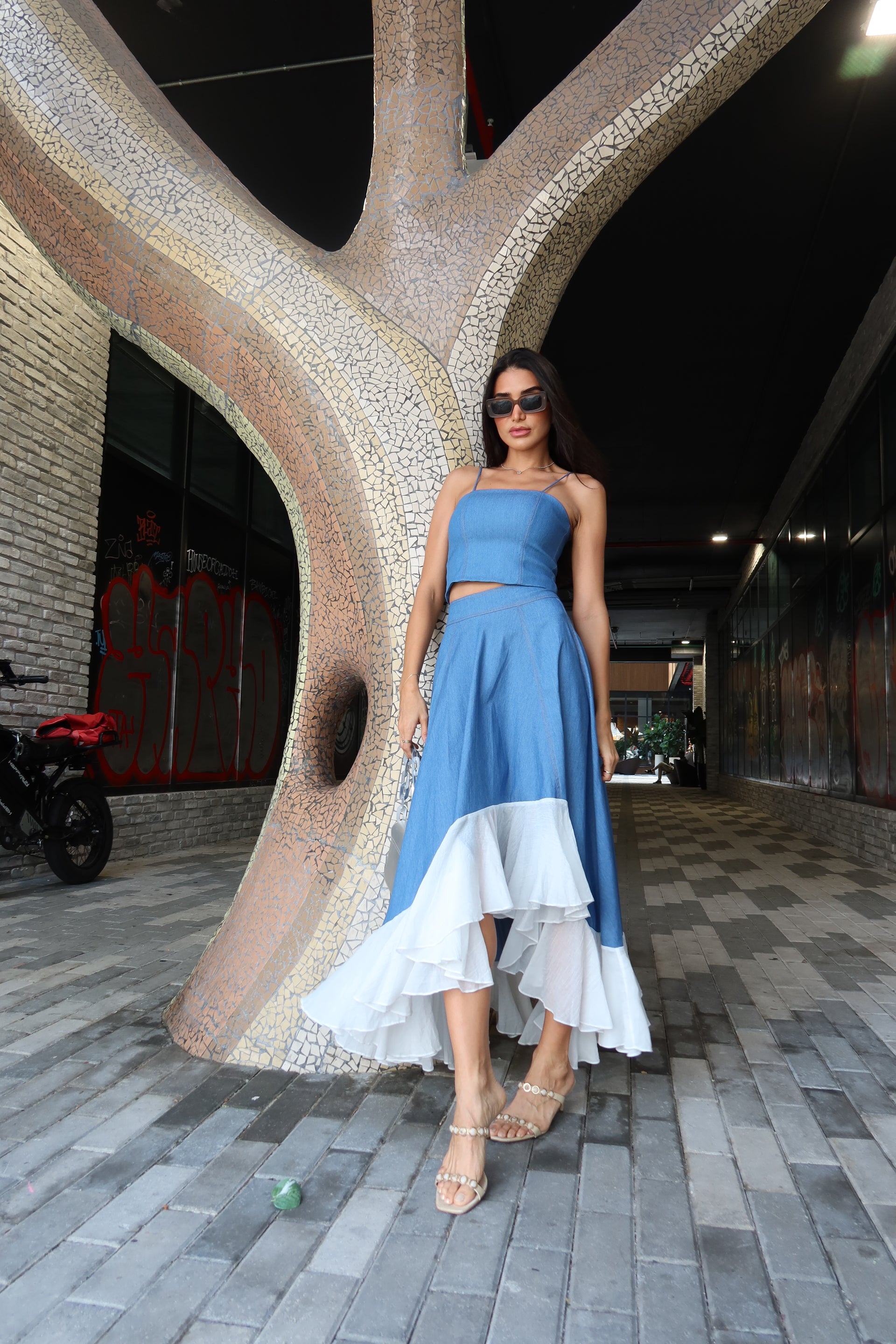 The Perla Denim Skirt is designed to move with effortless femininity. This high-waisted midi skirt features a softly flared silhouette finished with a contrasting ruffled hem that adds lightness, texture, and fluid motion. Its clean lines and graceful volume create a flattering shape that feels both modern and timeless.