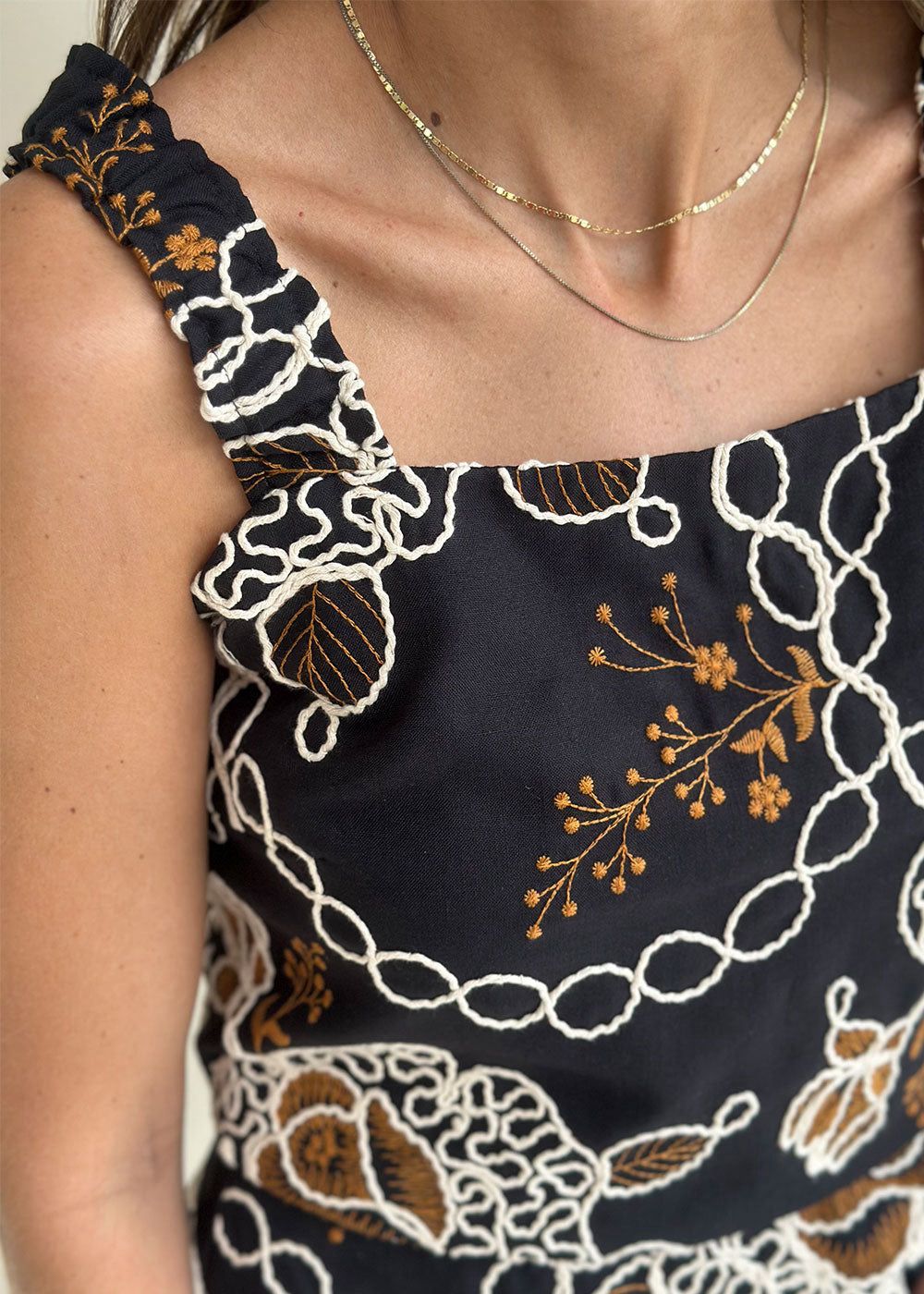 Felisa is a black embroidered poplin top featuring elastic shoulder straps with gathered details. It includes a full lining and a shirred back for a flattering and comfortable fit.
