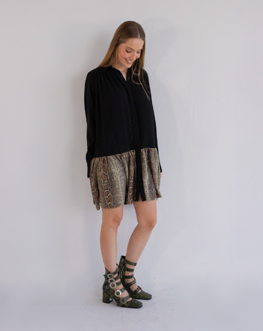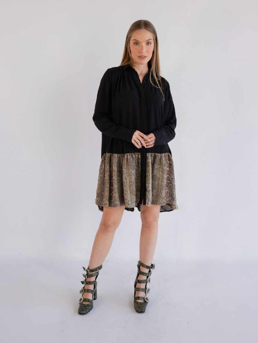 The Gregory Python Black Shirtwaist Dress is a bold fusion of elegance and edge, perfect for the modern, fashion-forward woman. This unique shirt-dress features a classic black upper that flows into a striking python-print lower hem, creating a captivating contrast of textures and patterns. With its relaxed silhouette and button-up design, it offers versatility and effortless sophistication, ideal for both casual outings and evening occasions. Crafted with care and attention to detail, the Gregory Python Black Dress is a statement piece that embodies timeless style and individuality.