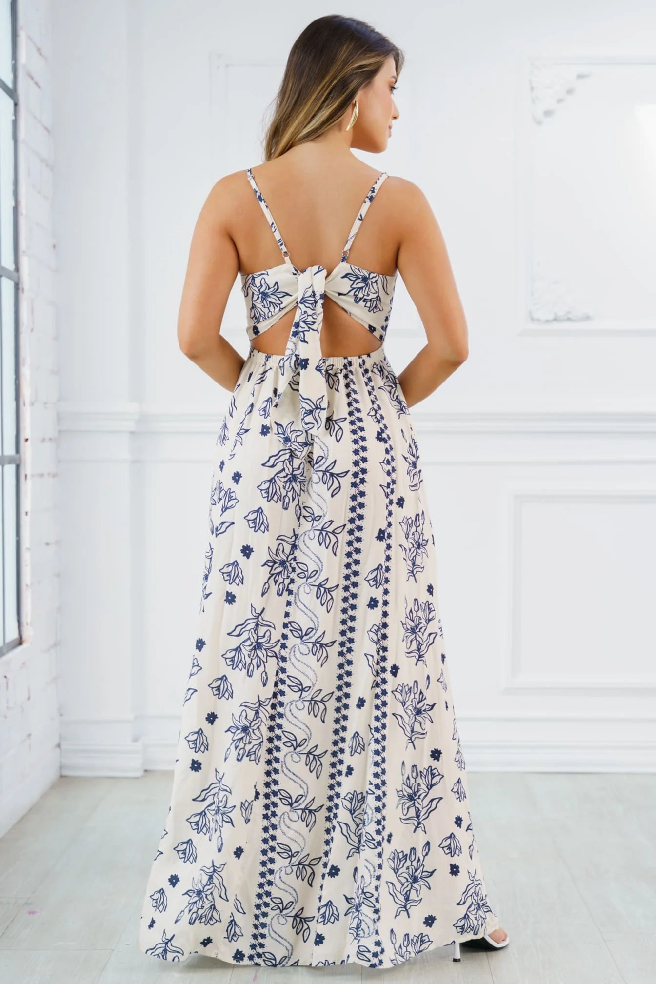 A dress that evokes freshness, romance, and casual elegance. Designed in an ivory base with delicate blue floral prints, this piece features decorative vertical lines that flatter the figure and add a chic, artisanal touch. Its straight neckline with thin straps and under-bust cut make it flattering and comfortable for any occasion.